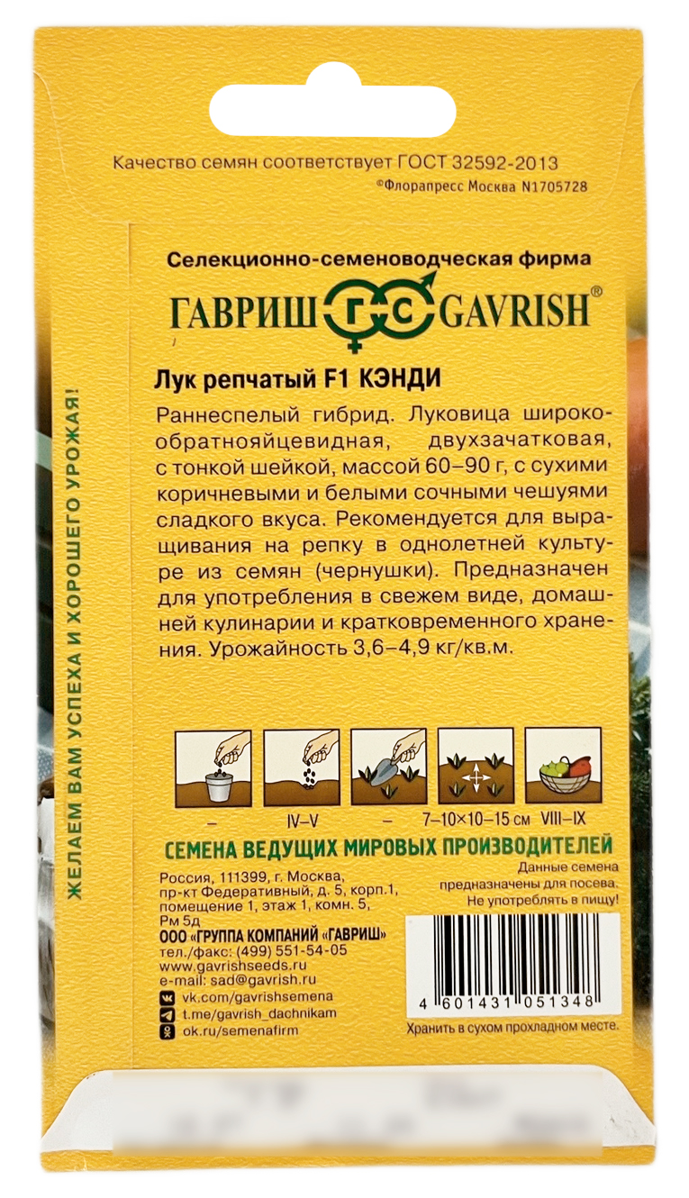 Лук репчатый КЭНДИ F1 ГАВРИШСреднеранний (107-109 дней от всходов до массового полегания и пожелтения листьев) гибрид салатного двухзачаткового репчатого лука. Выращивают в однолетней культуре из семян и в двулетней из севка. При выращивании из севка формирует луковицу массой до 800 г, из семян — до 100 г. Луковицы округлой формы с сочной, нежной мякотью. Сухие чешуи золотисто-желтого цвета, сочные — белые. Рекомендуется для употребления в свежем виде для салатов и для непродолжительного хранения (до 6 месяцев). Очень хорошо подходит для получения суперраннего урожая при выращивании рассадным способом. Посев на рассаду — в марте, высадка рассады в открытый грунт — в мае. Посев семян непосредственно в открытый грунт производят в конце апреля — начале мая, на глубину 1,0-1,5 см. Схема посева: 7-10x20 см.