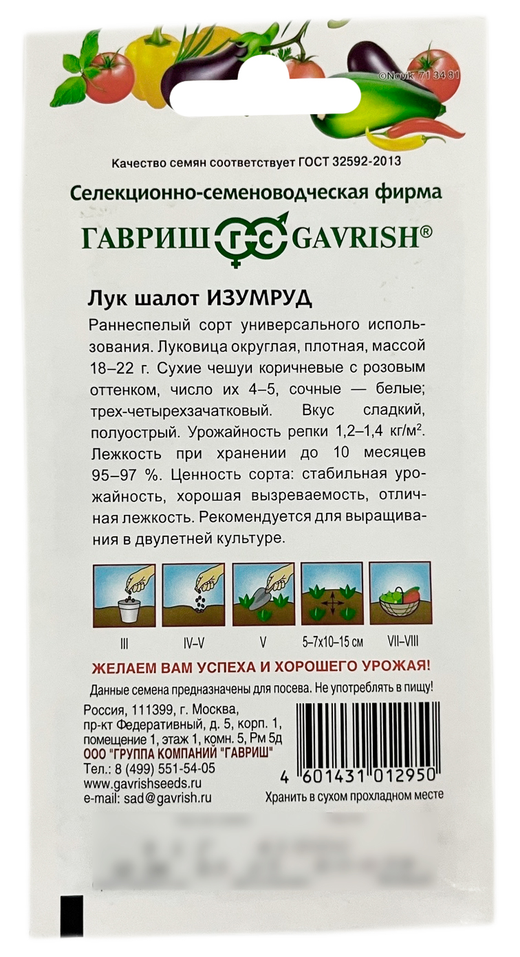 Лук шалот ИЗУМРУД ГАВРИШРаннеспелый сорт, универсального использования. Луковица округлая, плотная, массой 18-22 г. Сухие чешуи коричневые с розовым оттенком, число их 4-5, сочные - белые, трех-четырехзачатковый. Вкус полуострый. Урожайность репки 1,2-1,4 кг/м2. Лежкость при хранении до 10 месяцев 95-97%. Ценность сорта: стабильная урожайность, хорошая вызреваемость, отличная лежкость. Рекомендуется для выращивания в двулетней культуре.