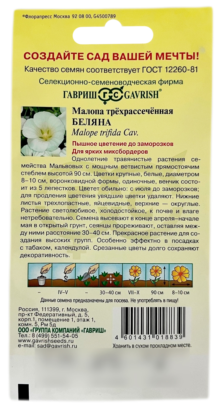 Малопа трёхрассечённая Беляна ГАВРИШОднолетние, травянистые растения семейства Мальвовых с мощным ветвистым прямостоячим стеблем высотой 90 см. Цветки крупные, белые, диаметром 8 - 10 см, воронковидной формы, одиночные, венчик состоит из 5 лепестков. Цветет обильно, с июля до заморозков, для продления цветения увядшие цветки удаляют. Нижние листья 3-лопастные, яйцевидные, верхние – округлые. Растение светолюбивое, холодостойкое, к почве и влаге нетребовательно. Семена высевают в конце апреля — начале мая в открытый грунт, сеянцы прореживают, оставляя между ними расстояние 30 - 40 см. Прекрасное растение для создания высоких групп. Особенно эффектна в посадках с табаком, календулой. Срезанные цветы долго сохраняют декоративность.