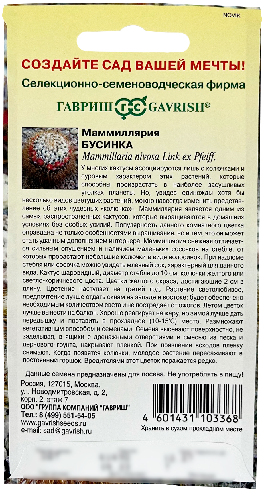Маммиллярия снежная Бусинка* 2 шт. Н20 (Mammillaria Haw.)У многих кактусы ассоциируются лишь с колючками и суровым характером этих растений, которые способны произрастать в наиболее засушливых уголках планеты. Но, увидев единожды хотя бы несколько видов цветущих растений, можно навсегда изменить представление об этих чудесных «колючках». Маммиллярия является одним из самых распространенных кактусов, которые выращиваются в домашних условиях без особых усилий. Популярность данного комнатного цветка оправдана не только особенностями выращивания, но и тем, что он может стать удачным дополнением интерьера. Маммиллярия Снежная отличается сильным опушением и наличием маленьких сосочков на стебле, от которых прорастают небольшие колючки в виде волосинок. При надломе стебля или сосочка можно увидеть млечный сок, характерный для данного вида. Кактус шаровидный, диаметр стебля до 10 см, колючки желтого или светло-коричневого цвета. Цветки желтого окраса, достигающие 2 см в длину. Цветение наступает на третий год. Растение светолюбивое, предпочтение лучше отдать окнам на западе и востоке: будет обеспечено необходимым количеством света и не пострадает от ожогов. Летом цветок лучше вынести на балкон. Хорошо реагирует на жару, но зимой лучше дать передышку и поставить в прохладное (10-15оС) место. Размножают вегетативным способом и семенами. Семена высевают поверхностно, не заделывая, в ящики с дренажными отверстиями и смесью из песка и дернового грунта, накрывают пленкой. При появлении всходов пленку снимают. Когда появятся колючки, молодое растение пересаживают в постоянный горшок. Вредителями этот цветок поражается редко.