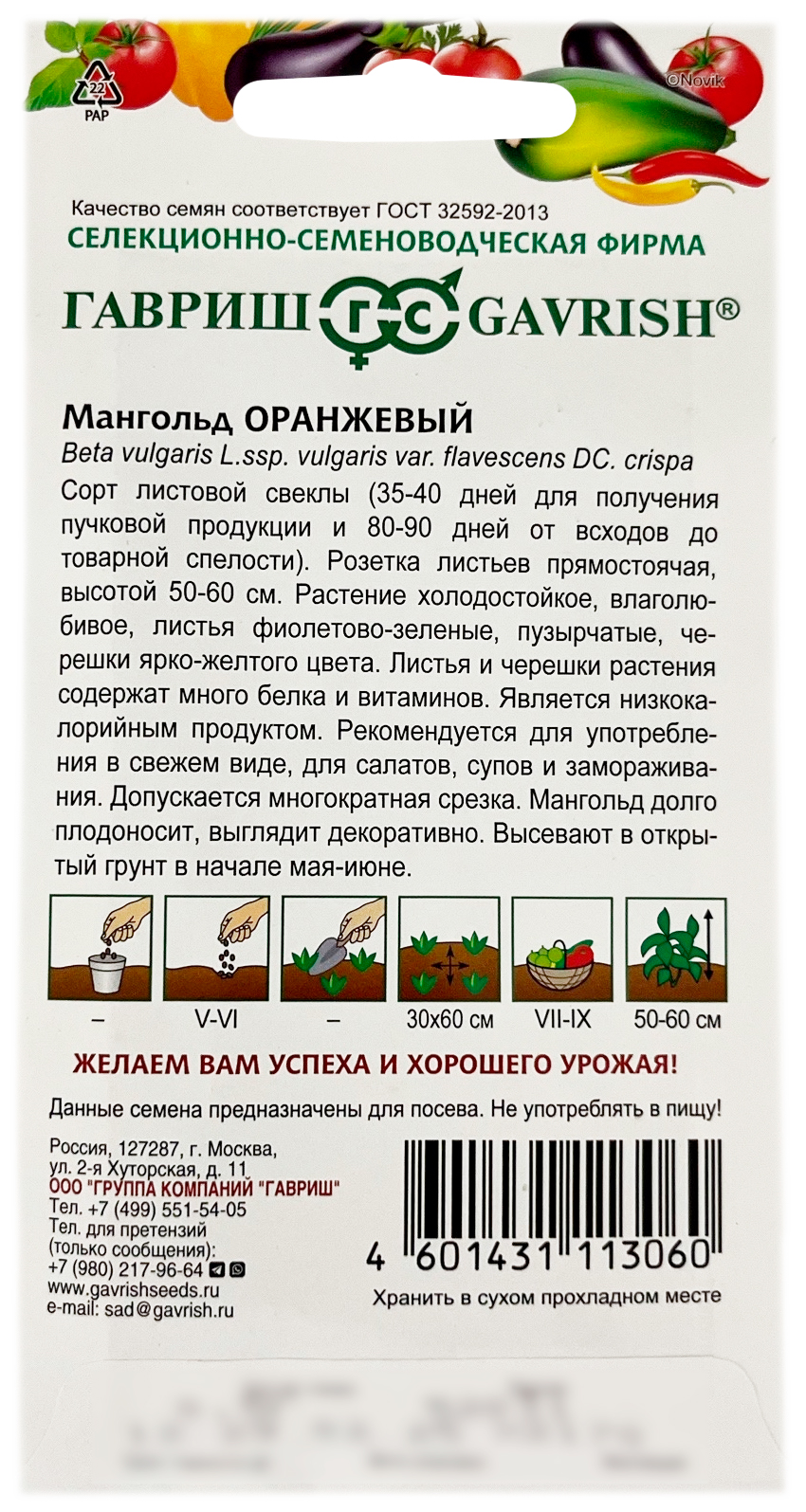 Мангольд ОРАНЖЕВЫЙ ГАВРИШСорт листовой свеклы (35-40 дней для получения пучковой продукции и 80-90 дней от всходов до товарной спелости). Розетка листьев прямостоячая, высотой 50-60 см. Растение холодостойкое, влаголюбивое, листья фиолетово-зеленые, пузырчатые, черешки ярко-желтого цвета. Листья и стебли растения содержат много белков и витаминов. Является низкокалорийным продуктом. Рекомендуется для употребления в свежем виде, салатов, супов и замораживания. Допускается многократная срезка. Сорт долго плодоносит, выглядит декоративно. Высевают в открытый грунт в начале мая-июне.