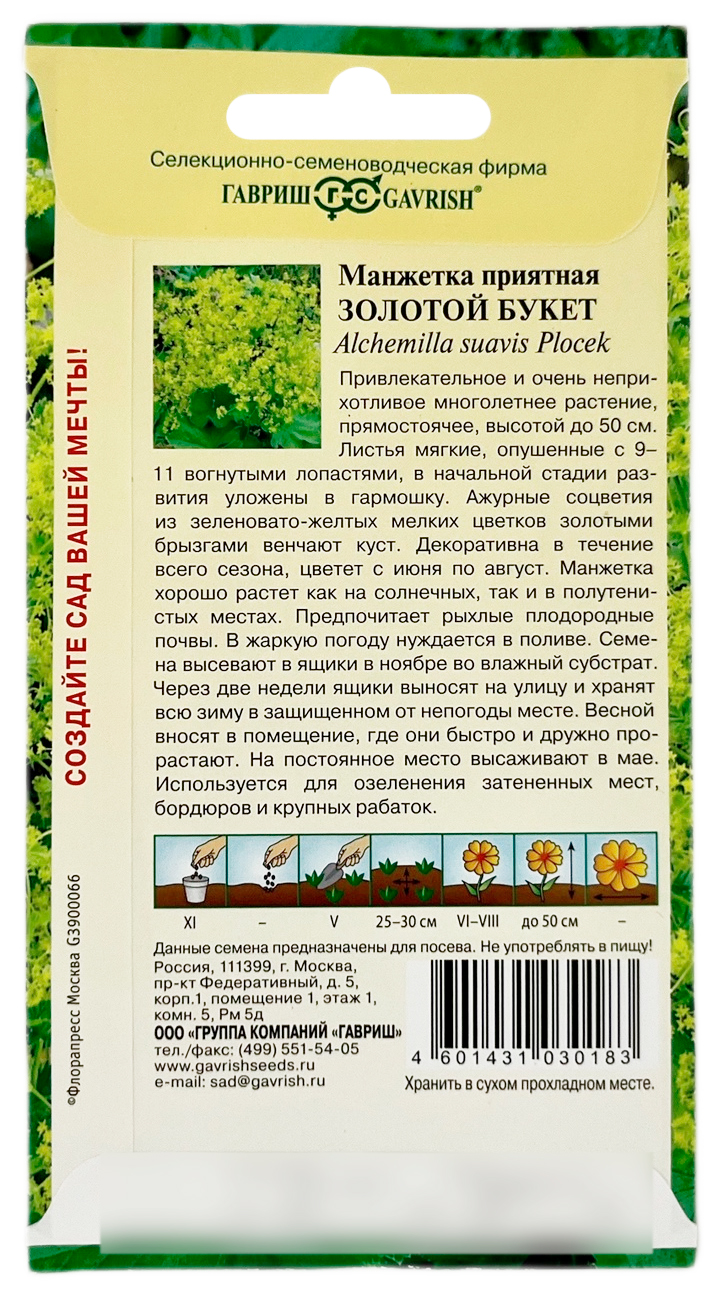 Манжетка Золотой букет ГАВРИШПривлекательное и очень неприхотливое многолетнее растение. Образует прямостоячий куст высотой до 50 см. Листья мягкие, опушенные с 9-11 вогнутыми лопастями, в начальной стадии развития уложены в «гармошку». Ажурные соцветия из зеленовато-желтых, мелких цветков, золотыми брызгами венчают куст. Декоративна в течении всего сезона, цветет с июня по август. Манжетка хорошо растет как на солнечных, так и в полутенистых местах. Предпочитает рыхлые, плодородные почвы. В жаркую погоду нуждается в поливе. Семена высевают в ящики в ноябре во влажный субстрат. Через две недели ящики выносят на улицу и хранят всю зиму в защищенном от непогоды месте. Весной вносят в помещение, где они быстро и дружно прорастают. На постоянное место высаживают в мае. Используется для озеленения затененных мест, бордюров и крупных рабаток.