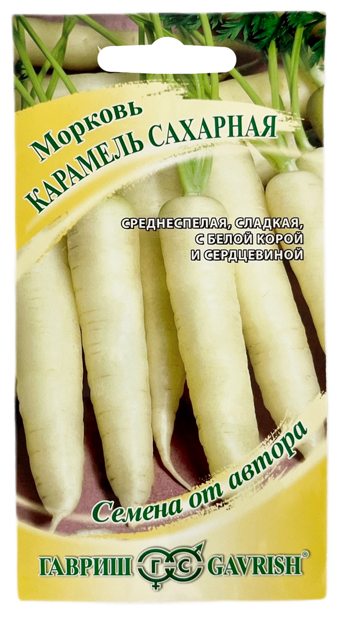 Морковь Карамель сахарная ГАВРИШСреднеспелый (100-115 дней от полных всходов до технической спелости) сорт моркови. Корнеплод удлиненно-конусовидный, длиной 18-22 см, массой 100-150 г, с белой корой и сердцевиной, сладкий. Отличные вкусовые качества. Использование универсальное: в свежем виде, кулинарии. Посев семян в грунт производится в конце апреля-начале мая на глубину 1 см, расстояние между рядами 15 см. Подросшие всходы прореживают, оставляя между растениями по 5-7 см.