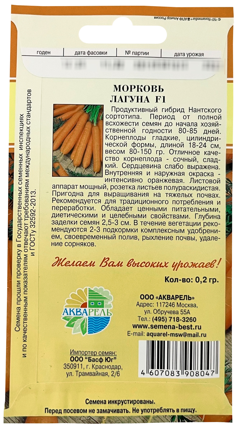 Морковь Лагуна F1 АКВАРЕЛЬПродуктивный гибрид Нантского сортотипа. Период от полной всхожести семян до начала хозяйственной годности 80-85 дней. Корнеплоды гладкие, цилиндрической формы, длиной 18-24 см, весом 80-150 гр. Отличное качество корнеплода - сочный, сладкий. Сердцевина слабо выражена. Внутренняя и наружная окраска - интенсивно оранжевая. Листовой аппарат мощный, розетка листьев полураскидистая. Пригодна для выращивания на тяжелых почвах. Рекомендуется для традиционного потребления и переработки. Обладает ценными питательными, диетическими и целебными свойствами. Глубина заделки семян 2,5-3 см. В течение вегетации рекомендуются 2-3 подкормки комплексным удобрением, своевременный полив, рыхление почвы, удаление сорняков.