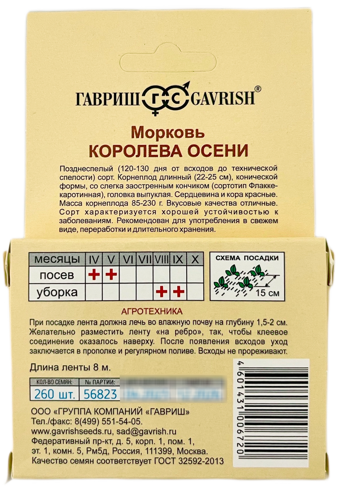 Морковь на ленте Королева осени 8 м (Daucus carota L.)Позднеспелый (120-130 дня от всходов до технической спелости) сорт. Посев семян в грунт производится в конце апреля – начале мая на глубину 1 см, расстояние между рядками 15 см. Подросшие всходы прореживают, оставляя между растениями по 5-7 см. Розетка листьев раскидистая. Лист средний, зеленый, мелкорассеченный. Корнеплод длинный (22-25 см), конической формы, со слегка заостренным кончиком (сортотип Флакке-каротинная), головка выпуклая. Сердцевина и кора красные. Масса корнеплода 85-230 г. Вкусовые качества отличные. Сорт характеризуется хорошей устойчивостью к заболеваниям. Рекомендован для потребления в свежем виде,переработки и длительного хранения. Урожайность 4-7 кг/м2.