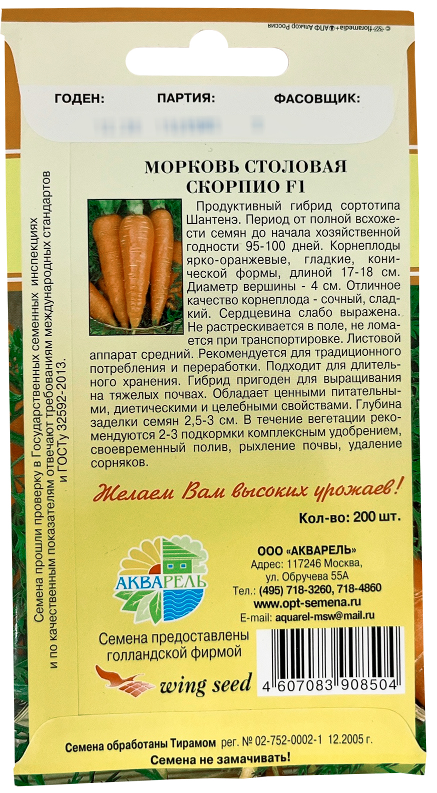 Морковь Скорпио F1 столовая АКВАРЕЛЬПродуктивный гибрид сортотипа Шантенэ. Период от полной всхожести семян до начала хозяйственной годности 95-100 дней. Корнеплоды ярко-оранжевые, гладкие, конической формы, длиной 17-18 см. Диаметр вершины - 4 см. Отличное качество корнеплода - сочный, сладкий. Сердцевина слабо выражена. Не растрескивается в поле, не ломается при транспортировке. Листовой аппарат средний. Рекомендуется для традиционного потребления и переработки. Подходит для длительного хранения. Гибрид пригоден для выращивания на тяжелых почвах. Обладает ценными питательными, диетическими и целебными свойствами. Глубина заделки семян 2,5-3 см. В течение вегетации рекомендуются 2-3 подкормки комплексным удобрением, своевременный полив, рыхление почвы, удаление сорняков.