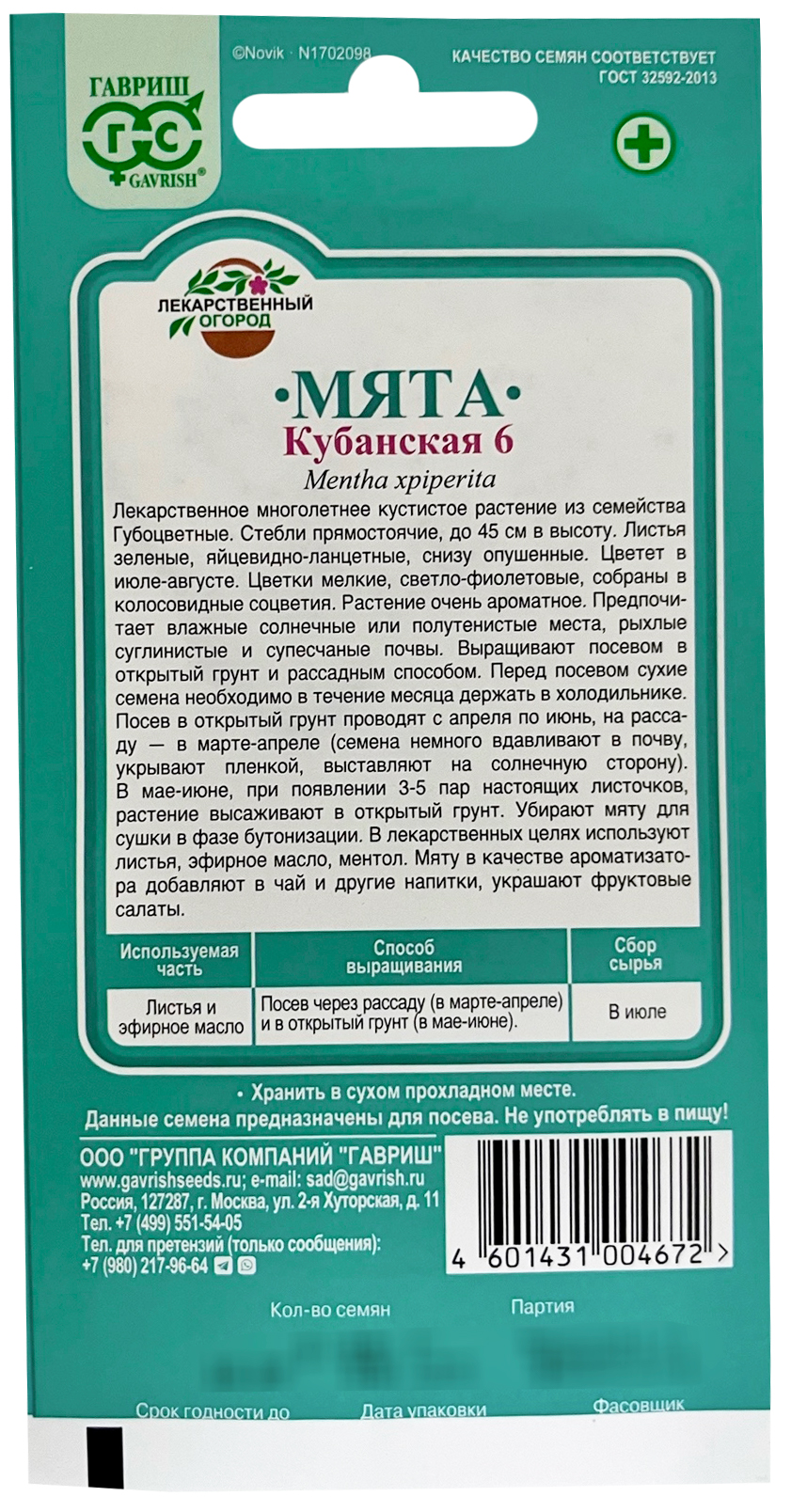 Мята Кубанская 6 ГАВРИШМноголетнее эфиромасличное растение высотой до 45 см с ползучим ветвистым корневищем. В качестве пряности листья и молодые побеги в свежем и сушеном виде добавляют в салаты, супы, используют как приправу к мясным, рыбным и овощным блюдам, а также используют для ароматизации напитков. Выращивают посевом в открытый грунт и рассадным способом. Посев в открытый грунт проводят с апреля по июнь, на рассаду – в марте. Окрепшие растения высаживают с расстоянием между растениями 20-30 см, между рядами 40-50 см. Предпочитает влажные места, рыхлые суглинистые почвы.