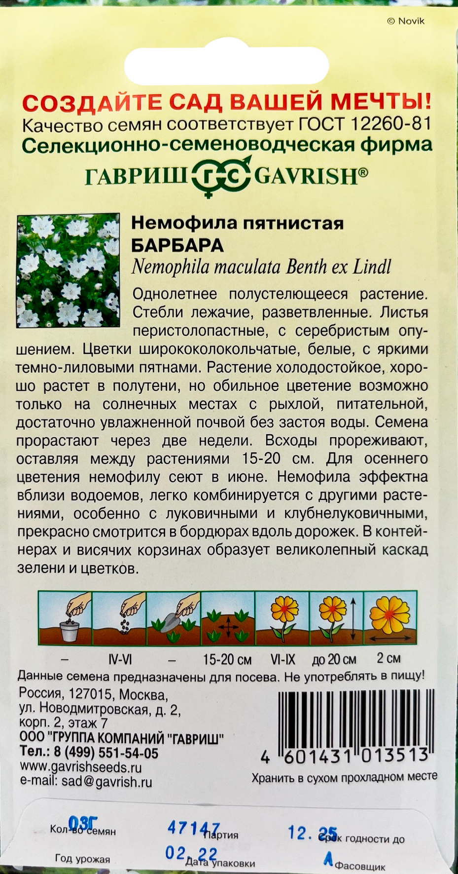 Немофила Барбара пятнистая 0,3 гНизкое однолетнее, полустелющееся растение до 20 см высотой. Стебли лежачие, разветвленные. Листья перисто-лопастные, опушенные. Цветки белые, ширококолокольчатые, с яркими темно-лиловыми пятнами на внешней стороне лепестков. Хорошо растут в полутени, но обильное продолжительное цветение возможно только при хорошем солнечном освещении. Предпочитают рыхлую, питательную, водопроницаемую почву, предъявляя повышенные требования к условиям увлажнения. Посев проводят в самые ранние сроки и следят, чтобы почва не пересыхала. Прорастают через две недели. Прореживают на расстоянии 20 см. Для осеннего цветения сеют в июне. Немофила эффектна вблизи водоемов, легко комбинируется с другими растениями и прекрасно смотрится в бордюрах. Ее можно сеять вдоль дорожек и между луковичными и клубнелуковичными растениями. При посадке в контейнеры или висячие корзины образует плотный каскад зелени и цветков, который великолепен на переднем плане композиции.