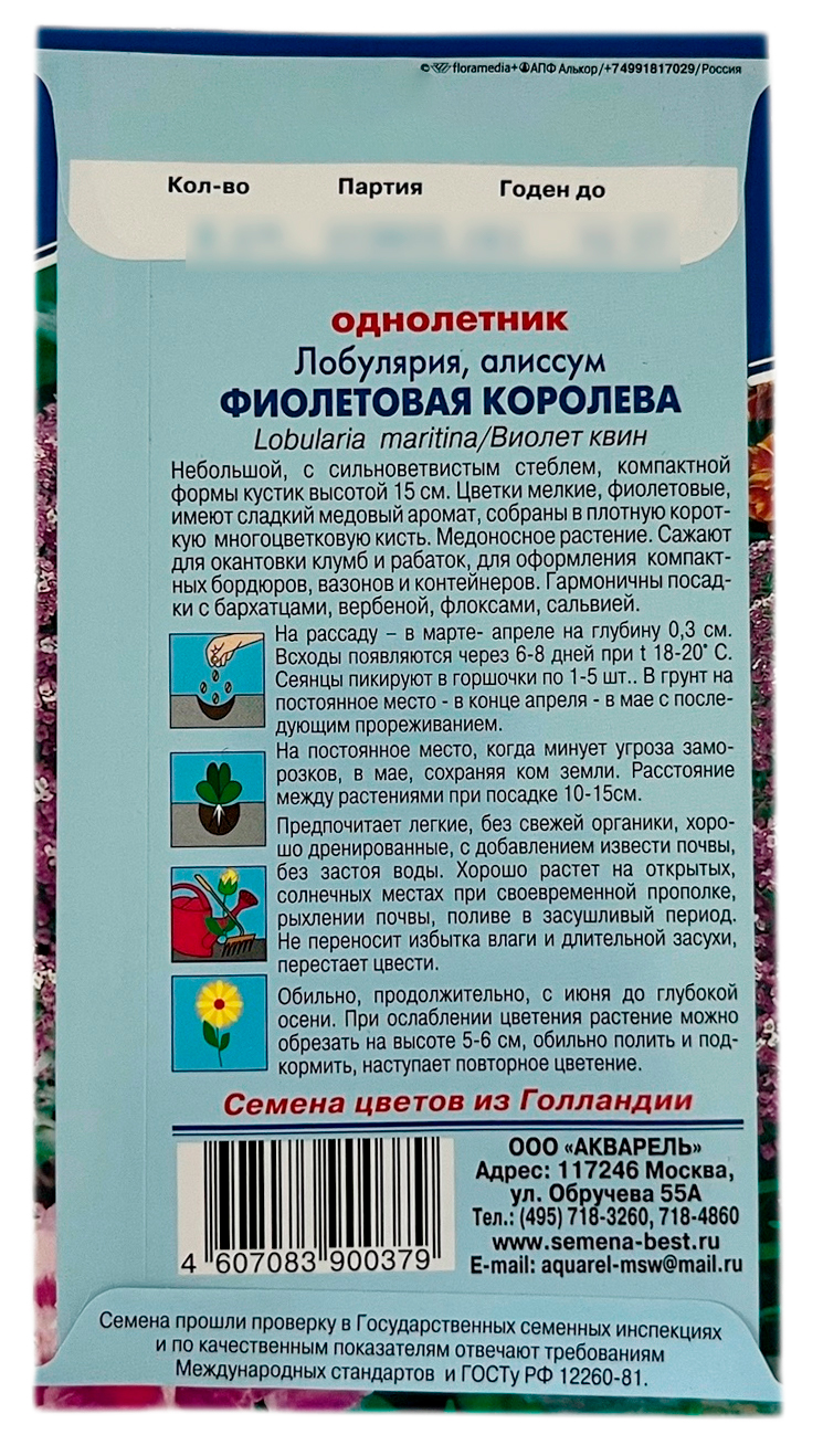 Лобулярия ФИОЛЕТОВАЯ КОРОЛЕВА АКВАРЕЛЬОднолетнее растение с сильноветвистым стеблем высотой 15 см, компактной формы. Цветки мелкие, темно-фиолетовой окраски со сладки медовым ароматом, собраны в плотную короткую многоцветковую кисть. Сажают для окантовки клумб и рабаток, для оформления бордюров, вазонов и контейнеров. Гармоничны посадки с бархатцами, вербеной, флоксами.