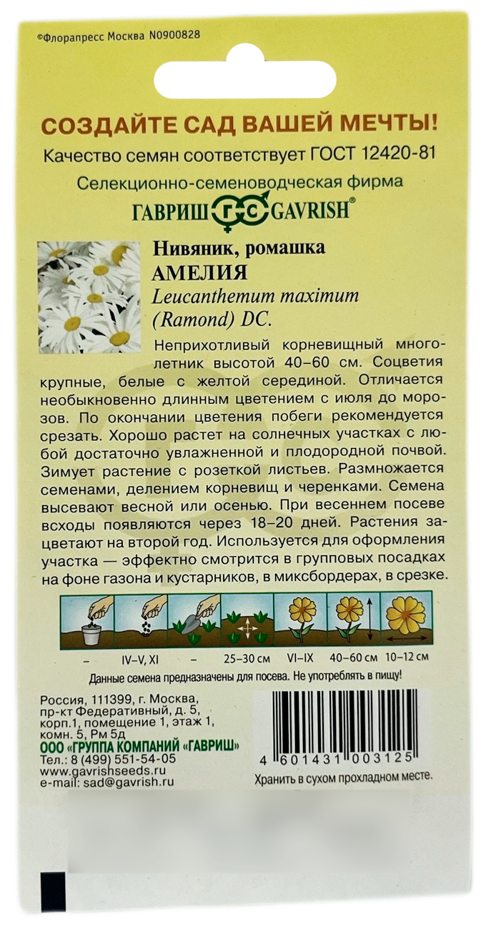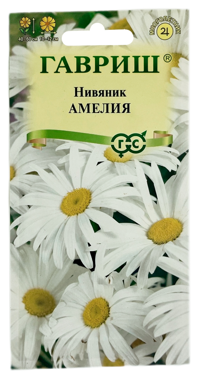 Нивяник ромашка АМЕЛИЯ ГАВРИШНеприхотливый корневищный многолетник высотой 40-60 см. Период цветения – июнь-август. Соцветия крупные, белые с желтой серединой. Хорошо растет на солнечных участках с любой достаточно увлажненной и плодородной почвой. Отличается необыкновенно длинным цветением — с июля до морозов. После окончания цветения побеги рекомендуется срезать, так как они быстро засыхают и портят внешний облик растения. Зимует растение с розеткой листьев. Размножается семенами, делением корневищ и черенками. Семена высевают весной или осенью. При весеннем посеве всходы появляются через 18-20 дней.
