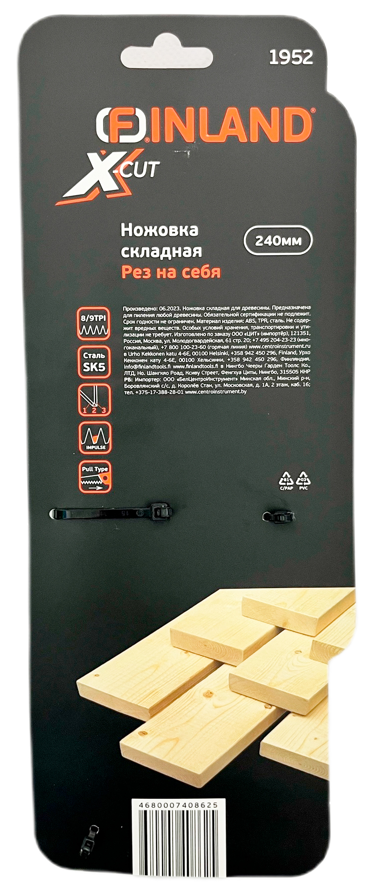 Ножовка складная для любой древесины FINLAND 1952Складная ножовка ЦЕНТРОИНСТРУМЕНТ 1952 Finland 240 1952 пилит при движении на себя. Инструмент выполнен из японской стали SK5, что обеспечивает прочность и долговечность. Специальная геометрия зуба X-CUT служит для легкого пиления. Трехгранная заточка зуба и импульсная закалка увеличивают эксплуатационный ресурс изделия.