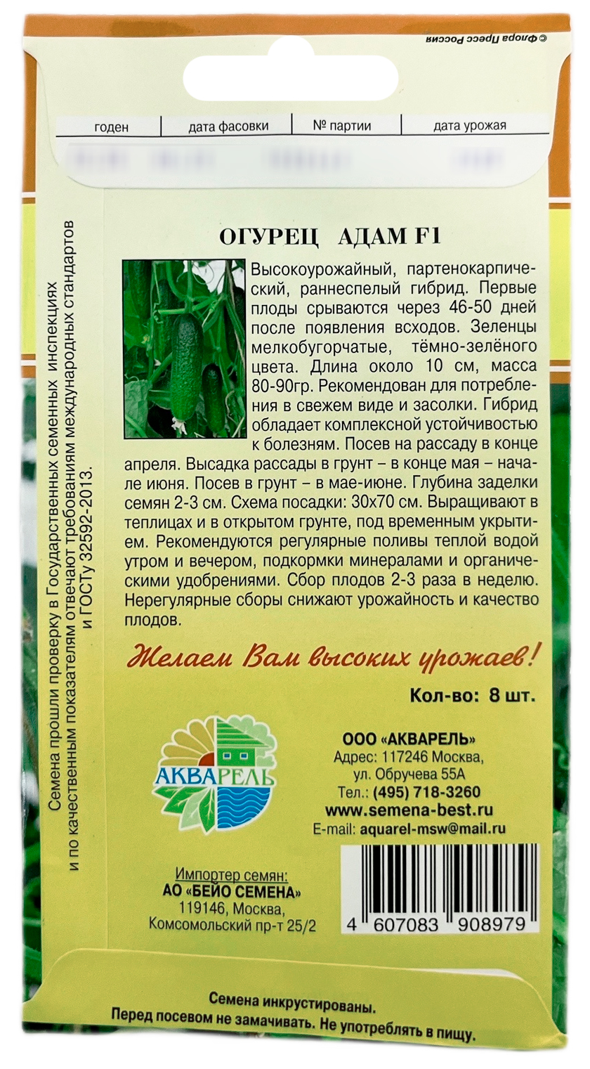 Огурец Адам F1 АКВАРЕЛЬВысокоурожайный, партенокарпический, раннеспелый гибрид. Первые плоды срываются через 46-50 дней после появления всходов. Зеленцы мелкобугорчатые, тёмно-зелёного цвета. Длина около 10 см, масса 80-90гр. Рекомендован для потребления в свежем виде и засолки. Гибрид обладает комплексной устойчивостью к болезням. Посев на рассаду в конце апреля. Высадка рассады в грунт – в конце мая – начале июня. Посев в грунт – в мае – июне. Глубина заделки семян 2-3 см. Схема посадки: 30х70 см. Выращивают в теплицах и в открытом грунте, под временным укрытием. Рекомендуются регулярные поливы теплой водой утром и вечером, подкормки минералами и органическими удобрениями. Сбор плодов 2-3 раза в неделю. Нерегулярные сборы снижают урожайность и качество плодов. Выращивание на шпалере значительно облегчает процесс уборки.