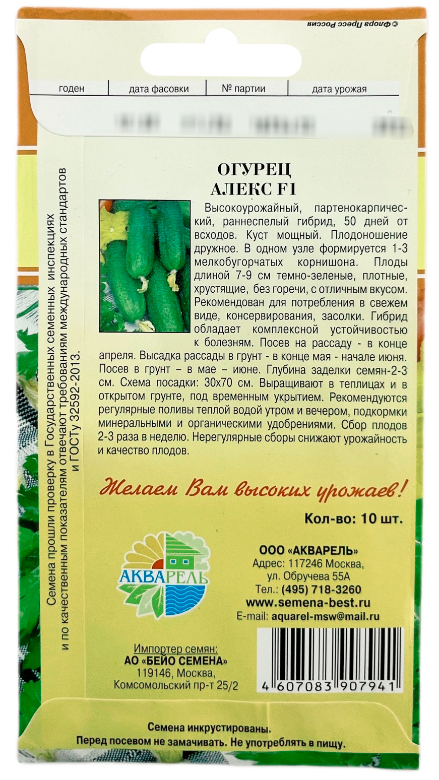Огурец Алекс F1 АКВАРЕЛЬВысокоурожайный, партенокарпический, раннеспелый гибрид, 50 дней от всходов. Куст мощный. Плодоношение дружное. В одном узле формируется 1-3 мелкобугорчатых корнишона. Плоды длиной 7-9 см темно-зеленые, плотные, хрустящие, без горечи, с отличным вкусом. Рекомендован для потребления в свежем виде, консервирования, засолки. Гибрид обладает комплексной устойчивостью к болезням. Посев на рассаду - в конце апреля.