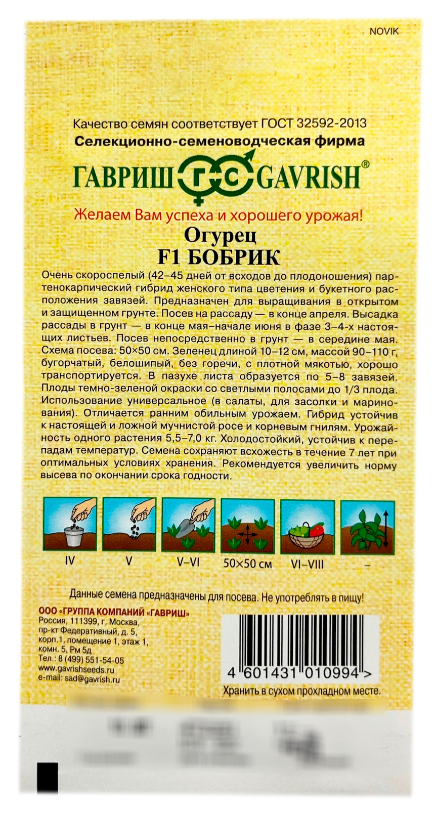 Огурец БОБРИК F1 ГАВРИШОчень скороспелый (42-45 дней от всходов до плодоношения) партенокарпический гибрид женского типа цветения и букетного расположения завязей. Предназначен для выращивания в открытом и защищенном грунте. Зеленец длиной 10-12 см, массой 90-110 г, частобугорчатый, белошипый, без горечи, с плотной мякотью, хорошо транспортируется. В пазухе листа образуется по 5-8 завязей. Плоды темно-зеленой окраски со светлыми полосами до 1/3 плода. Использование универсальное (салатное, для засолки, маринования). Отличается ранним обильным урожаем. Гибрид устойчив к настоящей и ложной мучнистой росам и корневым гнилям. Холодостойкий, устойчив к перепадам температур.