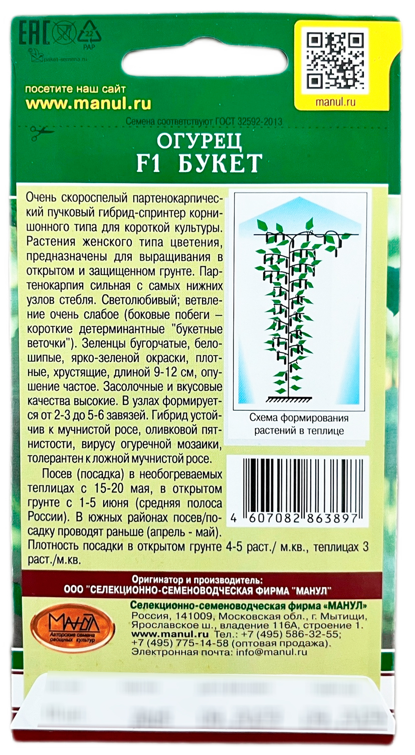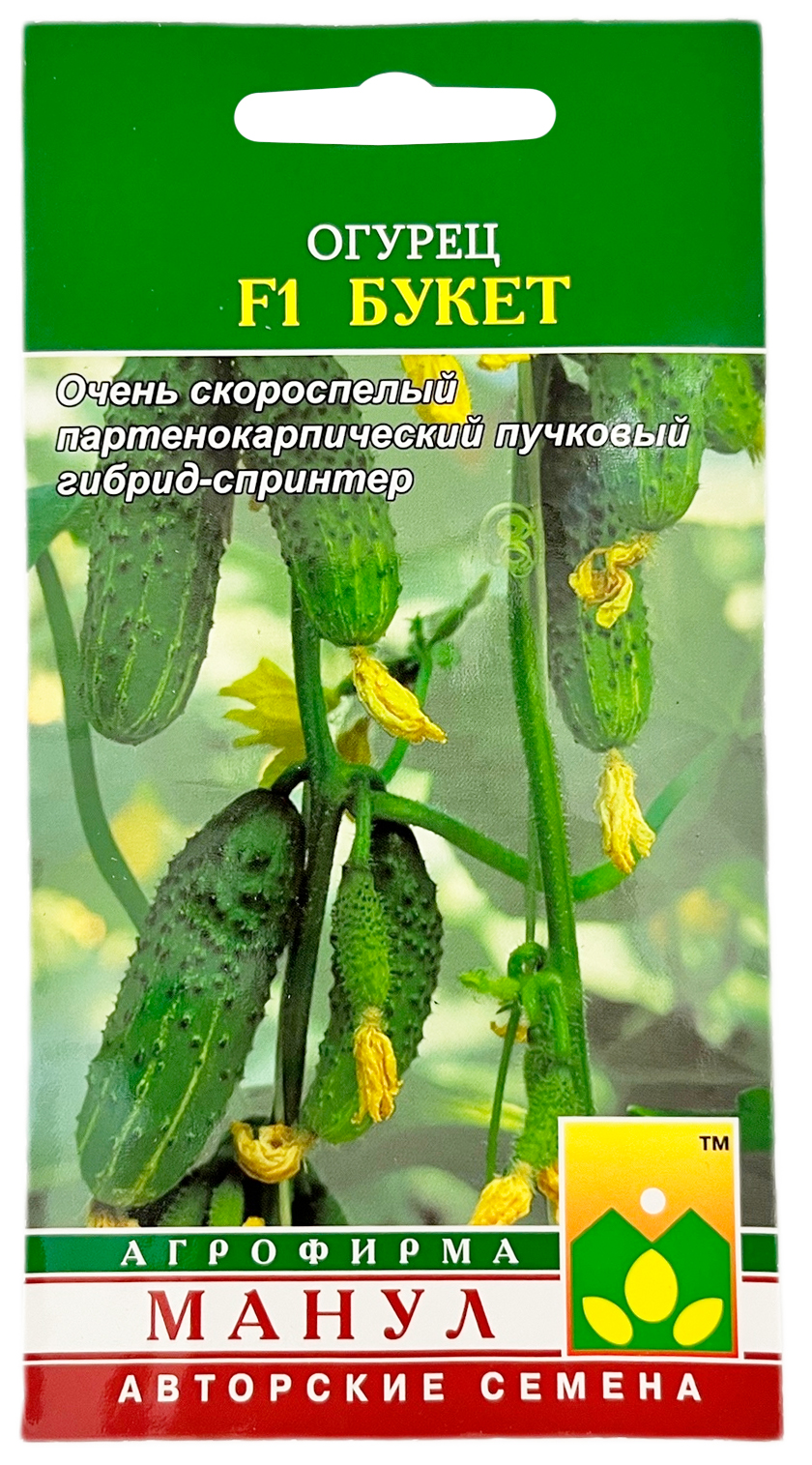 Огурец F1 Букет МАНУЛОчень скороспелый партенокарпический пучковый гибрид-спринтер корнишонного типа для короткой культуры. Растения женского типа цветения, предназначены для выращивания в открытом и защищенном грунте. Партенокарпия сильная с самых нижних узлов стебля. Светолюбивый; ветвление очень слабое (практически отсутствует). Зеленцы бугорчатые, белошипые, ярко-зеленой окраски, длиной 9-12 см, опушение частое. Вкусовые и засолочные качества высокие. В узлах формируется от 2-3 до 5-6 завязей. Гибрид устойчив к мучнистой росе, оливковой пятнистости, вирусу обыкновенной огуречной мозаики, толерантен к ложной мучнистой росе. Плотность посадки в теплицах 3 раст./м2, в открытом грунте 4-5 раст./м2.