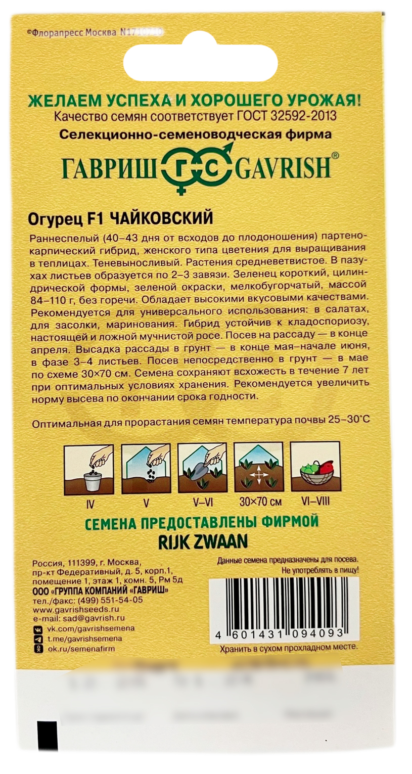Огурец F1 ЧАЙКОВСКИЙ ГАВРИШРаннеспелый (40-43 дня от всходов до плодоношения) партенокарпический гибрид, женского типа цветения для выращивания в теплицах. Растения средневетвистое. В пазухах листьев образуется по 2-3 завязи. Зеленец короткий, цилиндрической формы, зеленой окраски, мелкобугорчатый, массой 84-110 г, без горечи. Обладает высокими вкусовыми качествами. Рекомендуется для универсального использования: в салатах, для засолки, маринования. Гибрид устойчив к кладоспориозу, настоящей и ложной мучнистой росе. Посев на рассаду — в конце апреля. Высадка рассады в грунт — в конце мая-начале июня, в фазе 3-4 листьев.