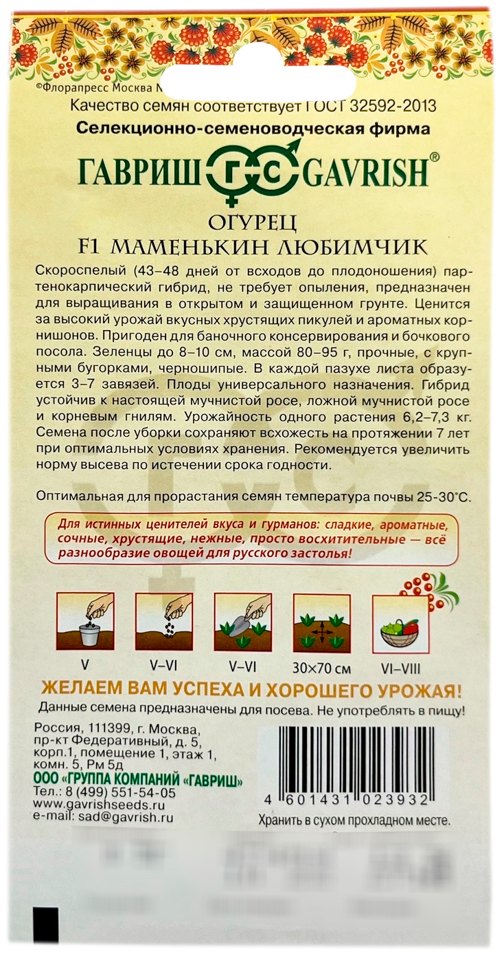 Огурец Маменькин любимчик F1 ГАВРИШСкороспелый (43-48 дней от всходов до плодоношения) партенокарпический гибрид, не требует опыления, предназначен для выращивания в открытом и защищенном грунте. Ценится за высокий урожай вкусных хрустящих пикулей и ароматных корнишонов для баночного консервирования.и бочкового посола. Зеленцы до 8-10 см, массой 80-95 г, прочные, с крупными бугорками, черношипые. В каждой пазухе листа образуется 3-7 завязей. Плоды универсального назначения. Гибрид устойчив к настоящей мучнистой росе, ложной мучнистой росе и корневым гнилям. Урожайность одного растения 6,2-7, 3 кг. Оптимальная для прорастания семян температура почвы 25-30о С.