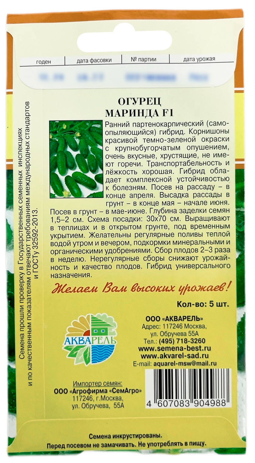 Огурец Маринда F1 АКВАРЕЛЬСуперпопулярный в Европе и России вот уже многие годы гибрид корнишона для переработки (особенно засолки) и потребления в свежем виде. Плоды крупнобугорчатые. Гибкий и очень надежный, приспособлен к различным условиям выращивания. Отличается ранним созреванием, довольно концентрированным плодообразованием и высокой урожайностью. Партенокарпик. Не нуждается в опылении пчелами. При достаточном питании формирует по 6-7 плодов на каждом узле. Растение очень мощное, довольно открытое, что облегчает уход и уборку. Обладает высочайшей толерантностью к стрессам. Плоды красивой темно-зеленой окраски и хорошей консистенции, без горечи. Соотношение длина/толщина 3.0:1. Устойчивость: CMV - вирус мозаики огурца; PM - настоящая мучнистая роса; Sc - кладоспориоз Желательны регулярные поливы теплой водой утром и вечером, подкормки минеральными и органическими удобрениями. Сбор плодов 2-3 раза в неделю. Нерегулярные сборы снижают урожайность и качество плодов. Для выращивания в открытом и защищенном грунте.