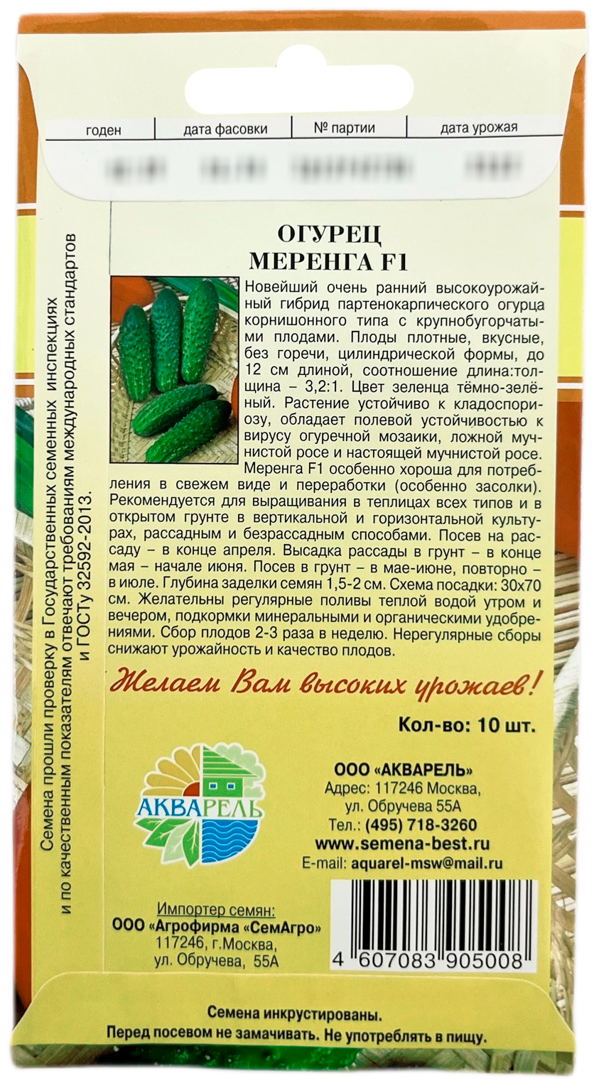 Огурец Меренга F1 АКВАРЕЛЬСуперранний (37-38дней), очень урожайный гибрид.