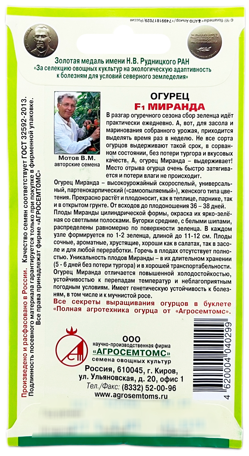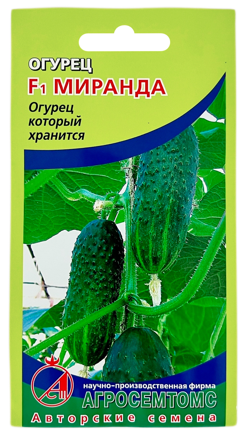 Огурец Миранда F1 АГРОСЕМТОМССкороспелый, высокоурожайный, универсальный гибрид с хорошо выраженной партенокарпией женского типа цветения. Растение сильнорослое, хорошо облиственное, в узле по 1-2 зеленца, длиной до 11-12 см. Плод без горечи, цилиндрической формы, окраска зеленная с белыми полосками, белыми шипами. Плоды сочные, ароматные, хрустящие, хороши как в салатах, так в засоле и для любой переработки. Особенность плодов в длительном хранении − 5-6 дней без потери тургора и в хорошей транспортабельности.