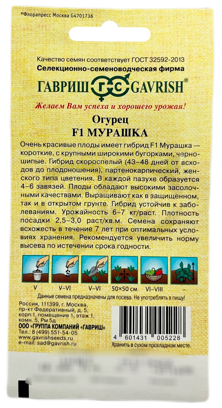 Огурец Мурашка F1 ГАВРИШОчень красивые плоды имеет гибрид F1 Мурашка - короткие, с крупными широкими бугорками, черношипые. Гибрид скороспелый (43-48 дней от всходов до плодоношения), партенокарпический, женского типа цветения. в каждой пазухе образуется 4 - 6 завязей. Плоды обладают высокими засолочными качествами. Гибрид F1 Мурашка можно выращивать как в защищенном, так и в открытом грунте. Гибрид устойчив к заболеваниям. Урожайность 6 - 7 кг/раст. Плотность посадки 2,5 - 3,0 раст/м2