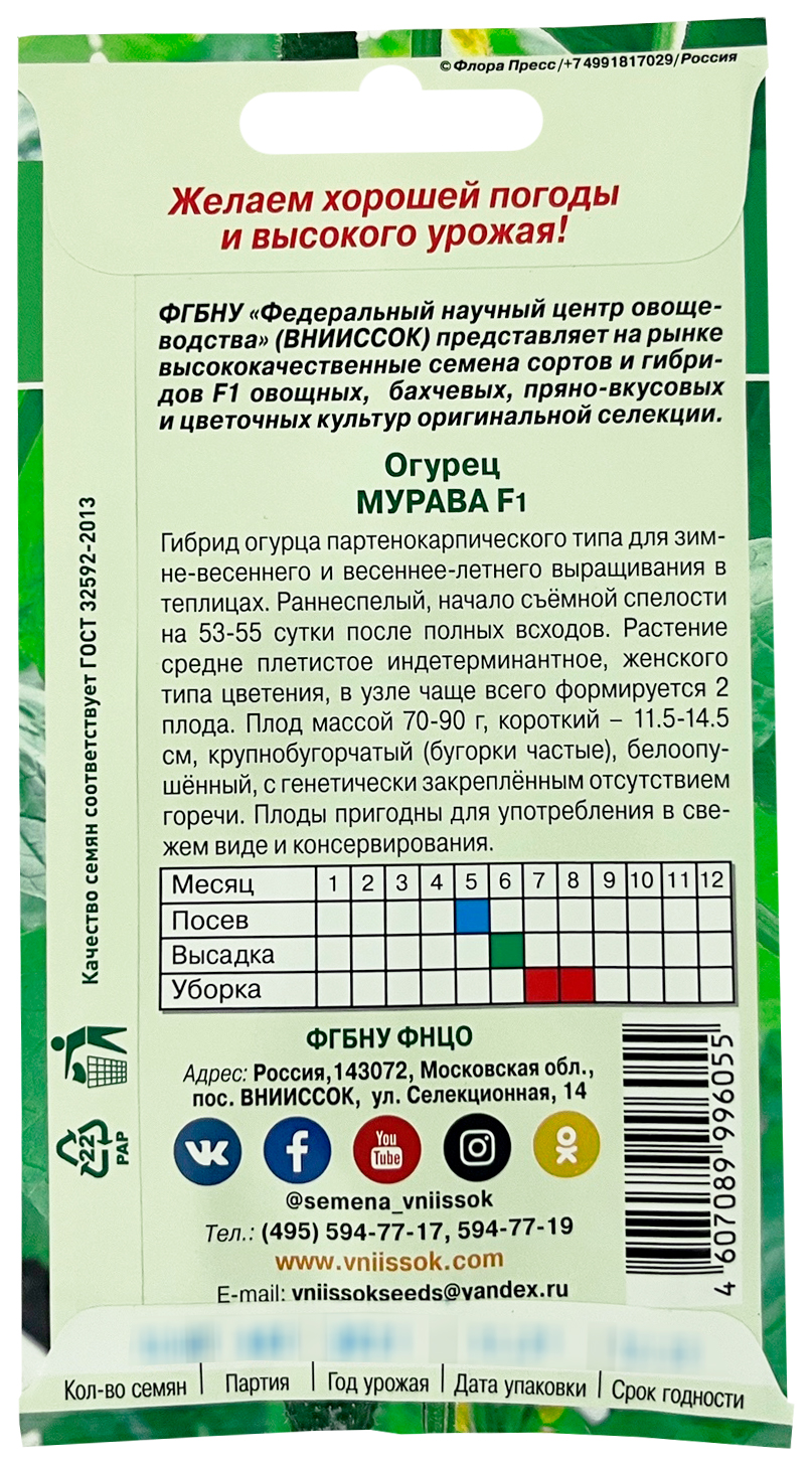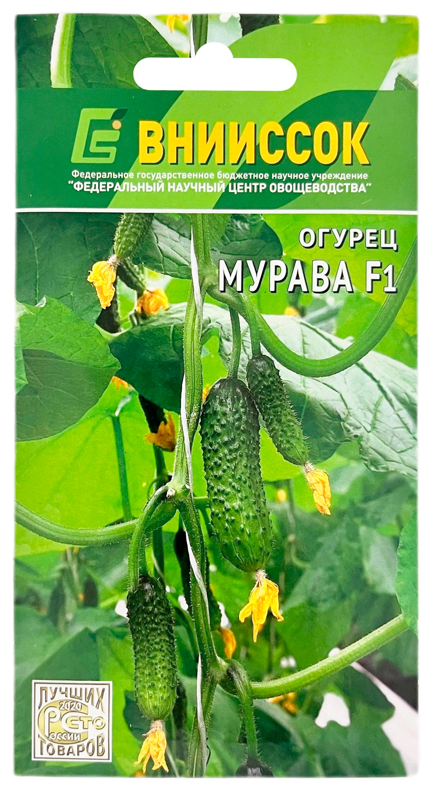 Огурец Мурава F1 ВНИИССОКГибрид огурца партенокарпического типа для зимне-весеннего и весенне-летнего выращивания в теплицах. Раннеспелый, начало съемной спелости на 53-55 сутки после полных всходов. Растение среднеплетистое индетерминантное, женского типа цветения, в узле чаще всего формируется 2 плода. Плод массой 70-90 гр, короткий - 11,5 - 14,5 см, крупнобугорчатый (бугорки частые), белоопушенный, с генетически закрепленным отсутствием горечи. Плоды пригодны для употребления в свежем виде и для консервирования.
