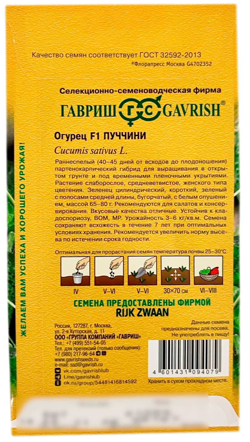Огурец Пуччини F1 ГАВРИШРаннеспелый (40-45 дней от всходов до плодоношения) партенокарпический гибрид для выращивания в открытом грунте и под временными пленочными укрытиями. Растение слаборослое, средневетвистое, женского типа цветения. Зеленец цилиндрический, короткий, зеленый с полосами средней длины, бугорчатый, с белым опушением, массой 65-80 г. Рекомендуются для салатов и консервирования. Вкусовые качества отличные. Устойчив к кладоспориозу, ВОМ, МР. Урожайность 3-6 кг/кв.м. Семена после уборки сохраняют всхожесть в течение 7 лет при оптимальных условиях хранения. Рекомендуется увеличить норму высева по окончании срока годности.