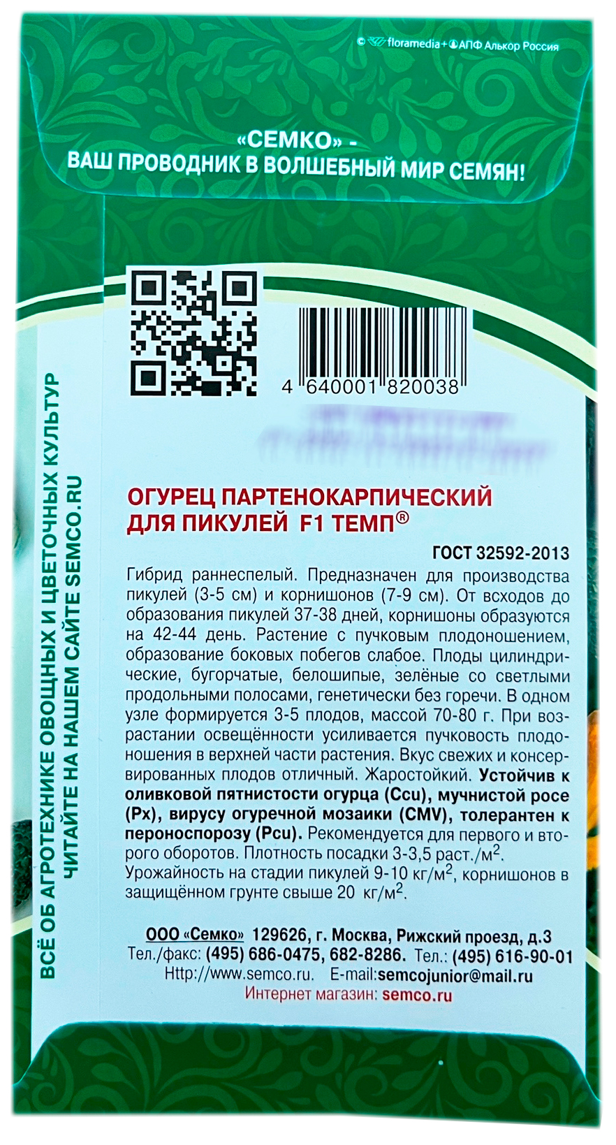 Семена огурца Темп F1Огурец Темп F1 - ранний партенокарпический гибрид для защищенного грунта корнишонного типа с пучковым плодоношением. Предназначен для производства пикулей (маленьких консервированных огурчиков длиной 3–5 см) и корнишонов (огурцов длиной 7–9 см). От всходов до образования пикулей 37–38 дней, корнишонов – 42–44 дня. Огурец с пучковым плодоношением, образование боковых побегов слабое. Плоды цилиндрические, бугорчатые, белошипые, зеленые со светлыми продольными полосами, без горечи. В одном узле формируется 3–5 плодов, массой 70–80 г. При возрастании освещенности усиливается пучковость плодоношения в верхней части растения. Вкус свежих и консервированных плодов отличный. Огурец Темп F1 жаростойкий, устойчив к кладоспориозу (Ccu) и мучнистой росе (Px), относительно устойчив к вирусу огуречной мозаики (CMV) и ложной мучнистой росе (Pcu). Рекомендуется для первого и второго тепличных оборотов. Плотность посадки 3,5–4 раст./м2. Урожайность на стадии пикулей 9–10 кг/м2, корнишонов в защищенном грунте свыше 20 кг /м2.