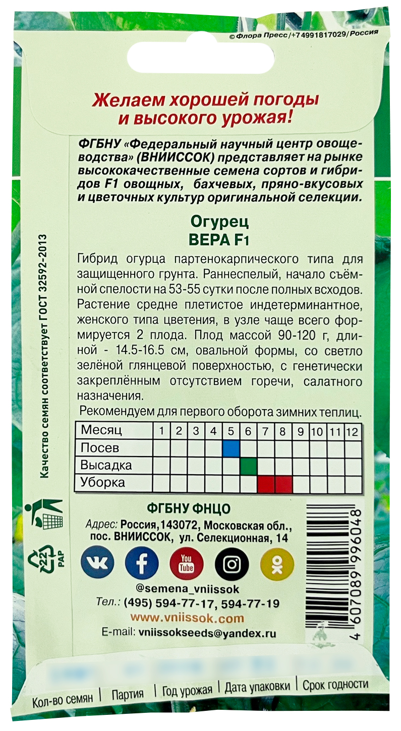 Огурец Вера F1 ВНИИССОКГибрид огурца партенокарпического типа для защищенного грунта. Раннеспелый, начало съёмной спелости на 53-55 сутки после полных всходов. Растение средне плетистое индетерминантное, женского типа цветения, в узле чаще всего формируется 2 плода. Плод массой 90-120 г, длиной - 14.5-16.5 см, овальной формы, со светло зелёной глянцевой поверхностью, с генетически закреплённым отсутствием горечи, салатного назначения.