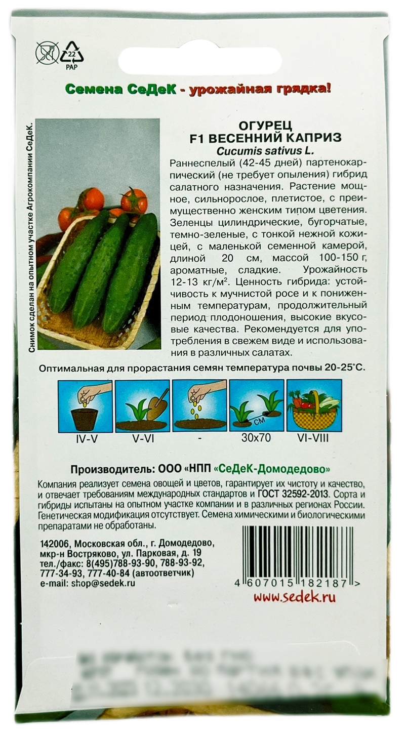 Огурец Весенний Каприз F1Раннеспелый (42-45 дней) партенокарпический (не требует опыления) гибрид салатного назначения. Растение мощное, сильнорослое, плетистое, с преимущественно женским типом цветения. Зеленцы цилиндрические, бугорчатые, темно-зеленые, с тонкой нежной кожицей, с маленькой семенной камерой, длиной 20 см, массой 100-150 г, ароматные, сладкие. Урожайность 12-13 кг/м²,. Ценность гибрида: устойчивость к мучнистой росе и к пониженным температурам, продолжительный период плодоношения, высокие вкусовые качества. Рекомендуется для употребления в свежем виде и использования в различных салатах.