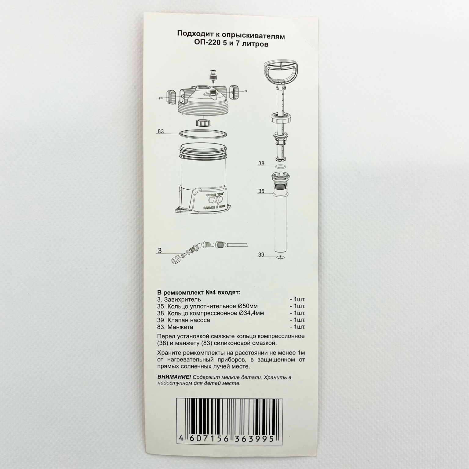 Ремкомплект №4 к опрыскивателям ОП-220 5 и 7 литровВ ремкомплект входят: завихритель, кольцо уплотнительное 50 мм, кольцо компрессионное 34,4 мм, клапан насоса, манжета.