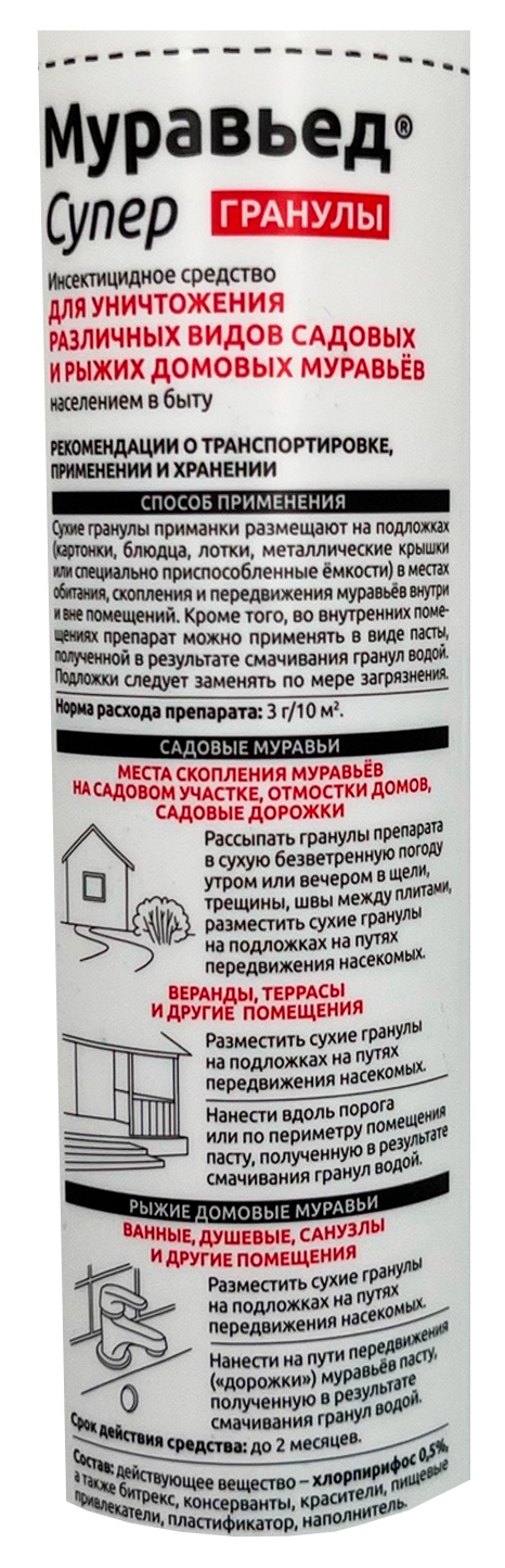 Использовать Муравьед Супер очень просто: чтобы избавиться от домовых муравьёв, гранулы раскладывают на подложках в местах передвижения насекомых. Если слегка смочить гранулы водой, получится паста, которую можно наносить вдоль порогов и по плинтусам помещений. 3 г препарата достаточно для обработки 10 м².