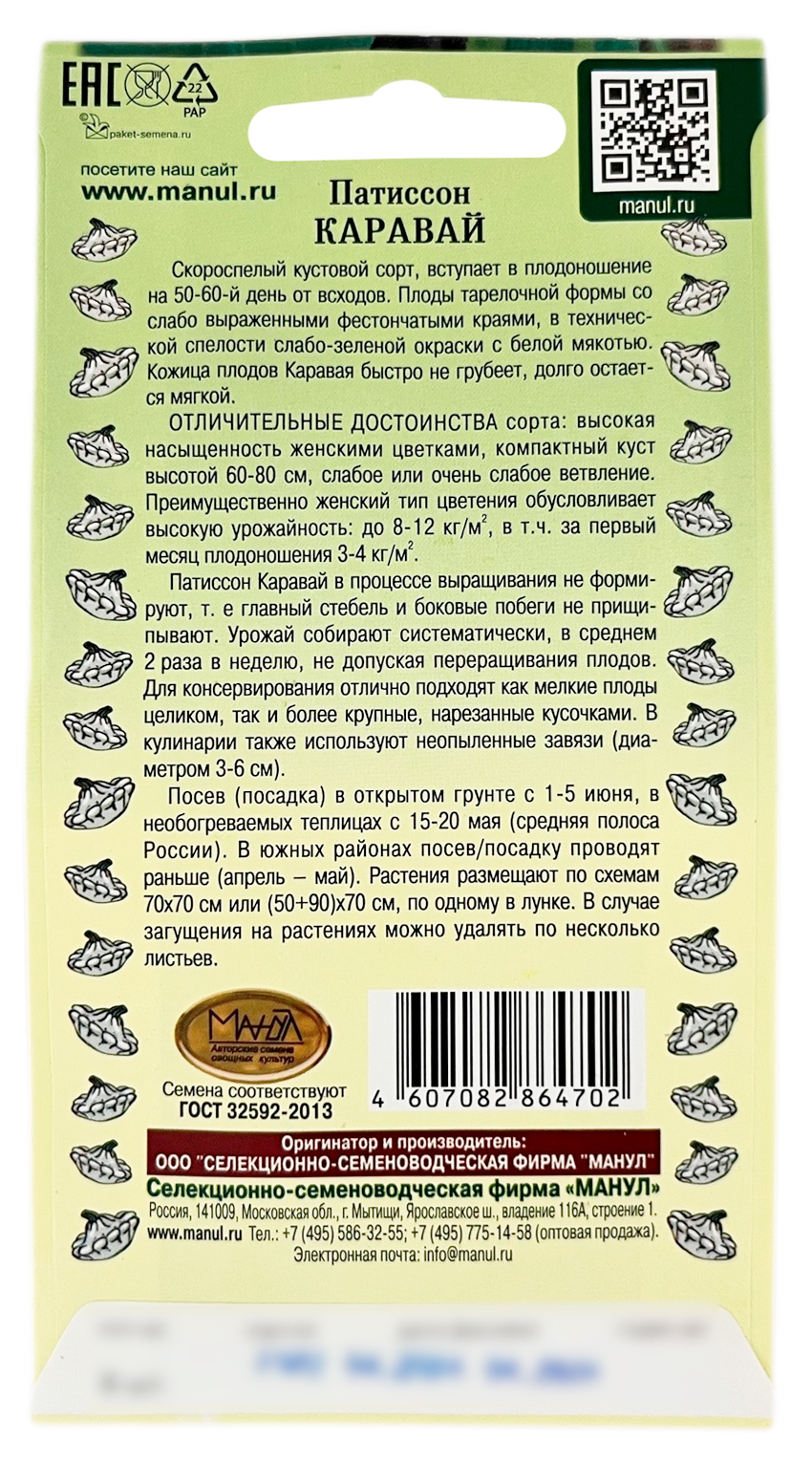 Патиссон КАРАВАЙ МАНУЛСкороспелый сорт, вступает в плодоношение на 50-60-й день от всходов. Плоды тарелочной формы со слабо выраженными фестончатыми краями, в технической спелости слабо-зеленой окраски с белой мякотью. По сравнению с сортом Белый 13 кожица плодов Каравая дольше остается мягкой, не так быстро грубеет. ОТЛИЧИТЕЛЬНЫЕ ДОСТОИНСТВА: высокая насыщенность женскими цветками, компактный куст высотой 60-80 см, слабое или очень слабое ветвление. Преимущественно женский тип цветения обусловливает высокую урожайность: до 8-12 кг/м2, в т. ч. за первый месяц плодоношения 3-4 кг/м2.