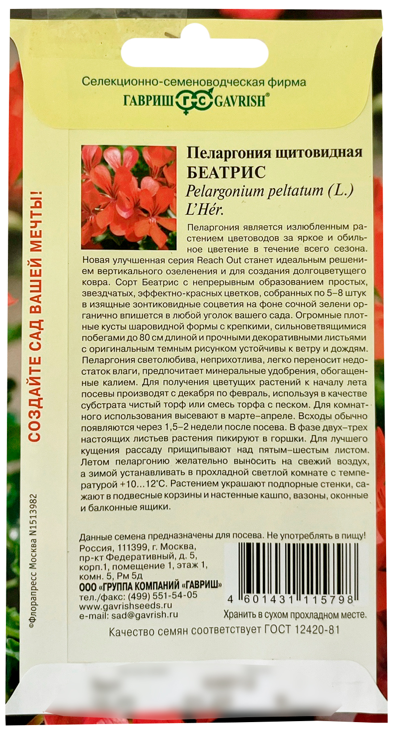 Пеларгония щитовидная Беатрис, ампельнаяПеларгония является излюбленным растением цветоводов за яркое и обильное цветение в течение всего сезона. Новая улучшенная серия Reach Out станет идеальным решением вертикального озеленения и для создания долгоцветущего ковра. Сорт Жаклин с непрерывным образованием простых, звездчатых, нежно-белых цветков с эффектной темной серединкой, собранных по 5-8 штук в изящные зонтиковидные соцветия на фоне сочной зелени органично впишется в любой уголок вашего сада. Огромные плотные кусты шаровидной формы с крепкими, сильноветвящимися побегами до 80 см длиной и прочными декоративными листьями с оригинальным темным рисунком устойчивы к ветру и дождям. Пеларгония светолюбива, неприхотлива, легко переносит недостаток влаги, предпочитает минеральные удобрения, обогащенные калием. Для получения цветущих растений к началу лета посевы производят с декабря по февраль, используя в качестве субстрата чистый торф или смесь торфа с песком. Для комнатного использования высевают в марте-апреле. Всходы обычно появляются через 1,5-2 недели после посева. В фазе двух-трех настоящих листьев растения пикируют в горшки. Для лучшего кущения рассаду прищипывают над пятым-шестым листом. Летом пеларгонию желательно выносить на свежий воздух, а зимой устанавливать в прохладной светлой комнате с температурой 10-12°C. Растением украшают подпорные стенки, сажают в подвесные корзины и настенные кашпо, вазоны, оконные и балконные ящики.
