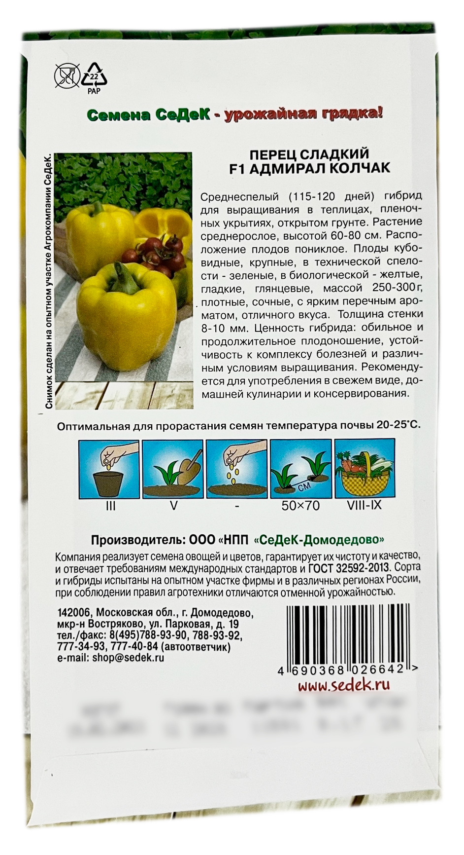 Перец сладкий F1 АДМИРАЛ КОЛЧАК СеДеКСреднеспелый (115-120 дней) гибрид для выращивания в теплицах, пленочных укрытиях, открытом грунте. Растение среднерослое, высотой 60-80 см. Расположение плодов пониклое. Плоды кубовидные, крупные, в технической спелости - зеленые, в биологической - желтые, гладкие, глянцевые, массой 250-300 г, плотные, сочные, с ярким перечным ароматом, отличного вкуса. Толщина стенки 8-10 мм. Ценность гибрида: обильное и продолжительное плодоношение, устойчивость к комплексу болезней и различным условиям выращивания. Рекомендуется для употребления в свежем виде, домашней кулинарии и консервирования.