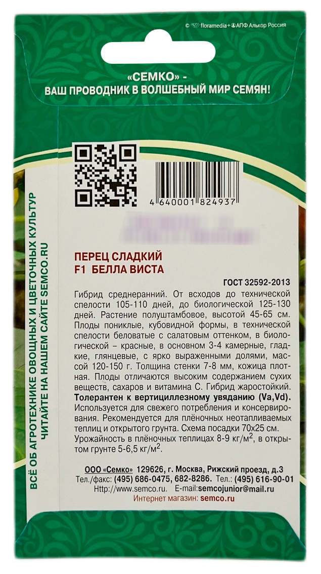 Перец сладкий БЕЛЛА ВИСТА СЕМКОСреднеранний гибрид для открытого грунта и пленочных теплиц. От всходов до технической спелости 105–110 дней, до биологической 125–130 дней. Растение сильное, полуштамбовое, компактное, высотой 45–65 см, формирования не требуется. Плоды пониклые, кубовидно-призмовидные, в технической спелости беловатые с салатовым оттенком, в биологической – красные, в основном 3–4 камерные, с ярко выраженными долями, глянцевые, массой 120–150 г. Кожица плотная толщина стенки 7–8 мм. Дружносозревающий. Плоды отличаются высокими вкусовыми качествами, содержанием сухих веществ, сахаров и витамина С. Перец Белла Виста F1 жаростойкий, засухоустойчивый. Относительно устойчив к вертициллезному увяданию (Va, Vd). Используется для потребления в свежем виде, консервирования, домашней кулинарии. Схема посадки 70х25 см Урожайность в пленочных теплицах 8–9 кг/м2, в открытом грунте 5–6,5 кг/м2.