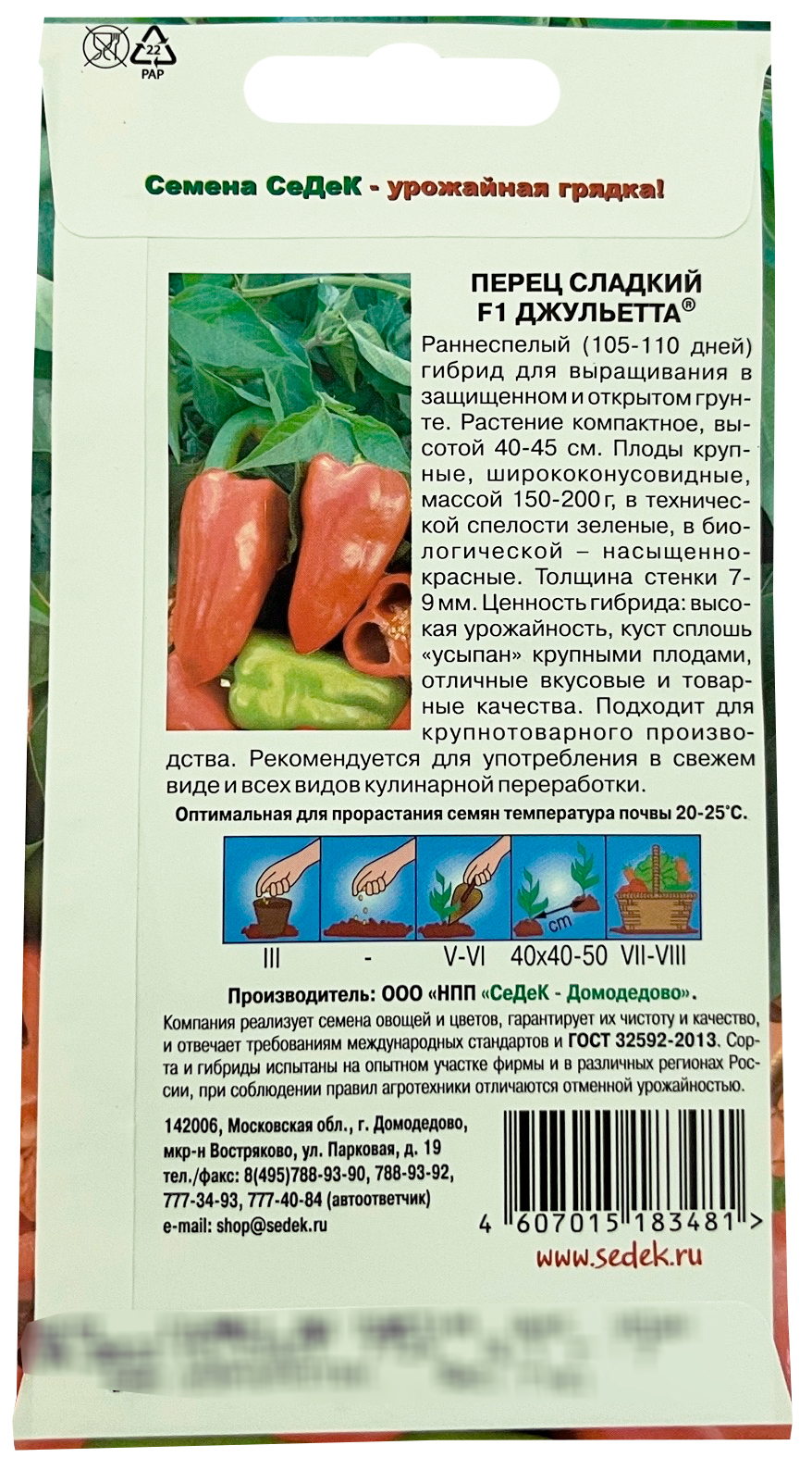 Перец сладкий ДжульеттаРаннеспелый (105-110 дней) гибрид для выращивания в защищенном и открытом грунте. Растение компактное, высотой 40-45 см. Плоды крупные, ширококонусовидные, массой 150-200 г, в технической спелости зеленые, в биологической – насыщенно-красные. Толщина стенки 7-9 мм. Ценность гибрида: высокая урожайность, куст сплошь «усыпан» крупными плодами, отличные вкусовые и товарные качества. Подходит для крупнотоварного производства. Рекомендуется для употребления в свежем виде и всех видов кулинарной переработки.