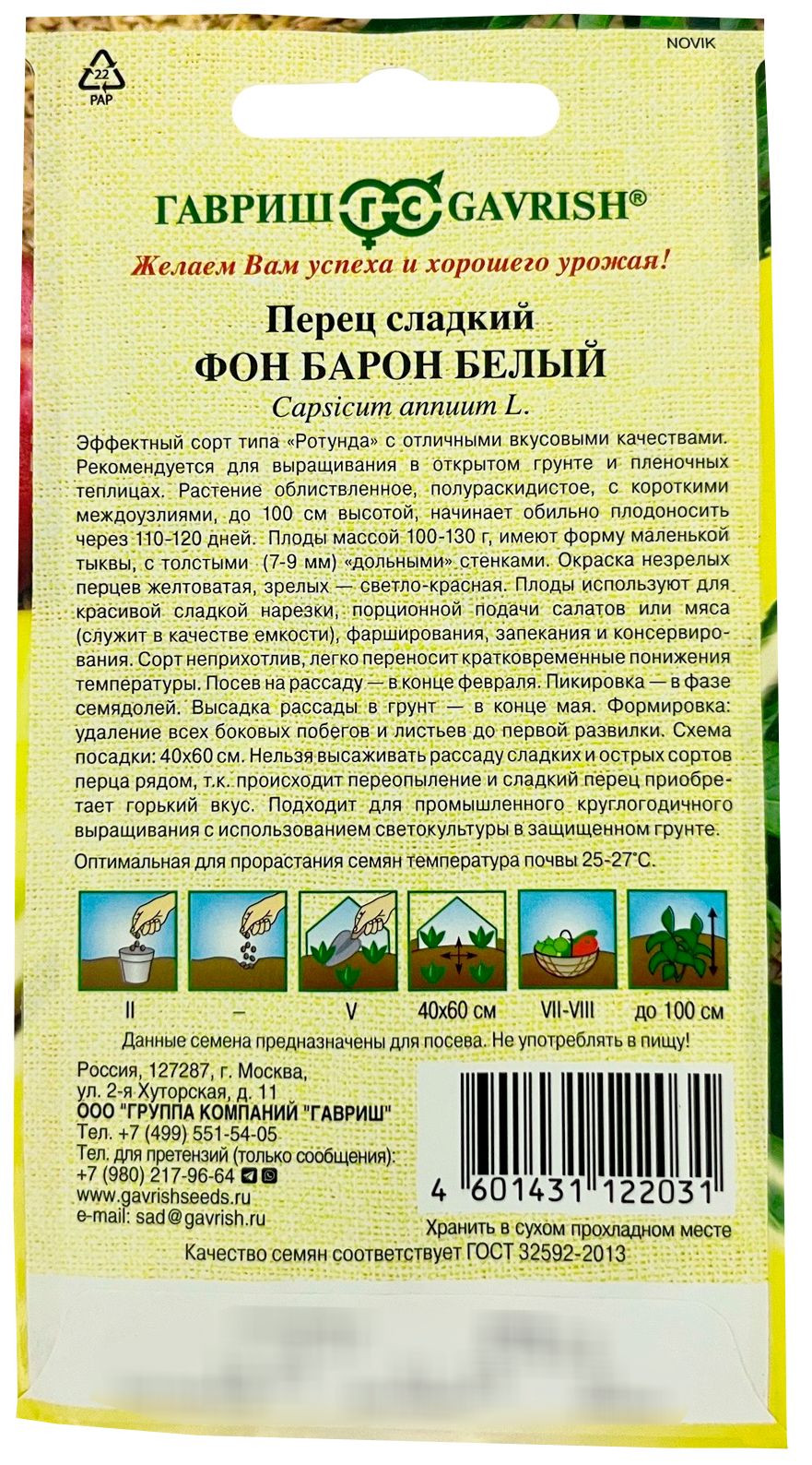 Перец сладкий ФОН БАРОН БЕЛЫЙ ГАВРИШЭффектный сорт типа «Ротунда» с отличными вкусовыми качествами. Рекомендуется для выращивания в открытом грунте и пленочных теплицах. Растение компактное, среднеоблиственное, с короткими междоузлиями, до 100 см высотой, начинает обильно плодоносить через 110-120 дней. Плоды массой 100-130 г, имеют форму маленькой тыквы, с толстыми (7-9 мм) «дольными» стенками. Окраска незрелых перцев желтоватая, зрелых — светло-красная. Плоды используют для красивой сладкой нарезки, порционной подачи салатов или мяса (служит в качестве емкости), фарширования, запекания и консервирования. Сорт неприхотлив, легко переносит кратковременные понижения температуры. Посев на рассаду — в конце февраля. Пикировка — в фазе семядолей. Высадка рассады в грунт — в конце мая. Формировка: удаление всех боковых побегов и листьев до первой развилки. Схема посадки: 40x60 см. Нельзя высаживать рассаду сладких и острых сортов перца рядом, т.к. происходит переопыление и сладкий перец приобретает горький вкус. Подходит для промышленного круглогодичного выращивания с использованием светокультуры в защищенном грунте.
