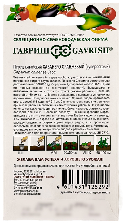 Перец китайский ХАБАНЕРО ОРАНЖЕВЫЙ ГАВРИШЗнаменитый «огненный» перец особо жгучего вкуса — неизменный ингредиент острого соуса Табаско. По шкале Сковилла острота перца достигает около 300.000 ед. Сорт ранний, созревает через 100-110 дней от полных всходов до технической спелости. Выращивается в пленочных теплицах и открытом грунте (южные регионы). Растение высотой от 60 см до 1 м. Можно выращивать в домашних условиях на подоконнике. Плодоносит очень обильно. Зрелые плоды оранжевого цвета, массой 5-8 г, длиной 3-4 см. Степень остроты перца не меняется при выращивании в различных климатических условиях. В кулинарии используют как специю для различных блюд, салатов, острых соусов, подходит для сушки. Посев на рассаду — в конце февраля-марте, высадка в грунт— в конце мая-начале июня. Глубина заделки семян до 1 см. Пикировка в фазе 1-2-х настоящих листьев. Нельзя высаживать рассаду сладких и острых сортов перца рядом, т.к. происходит переопыление и сладкий перец приобретает горький вкус. Рекомендуется надевать перчатки при сборе плодов и работе с семенами.