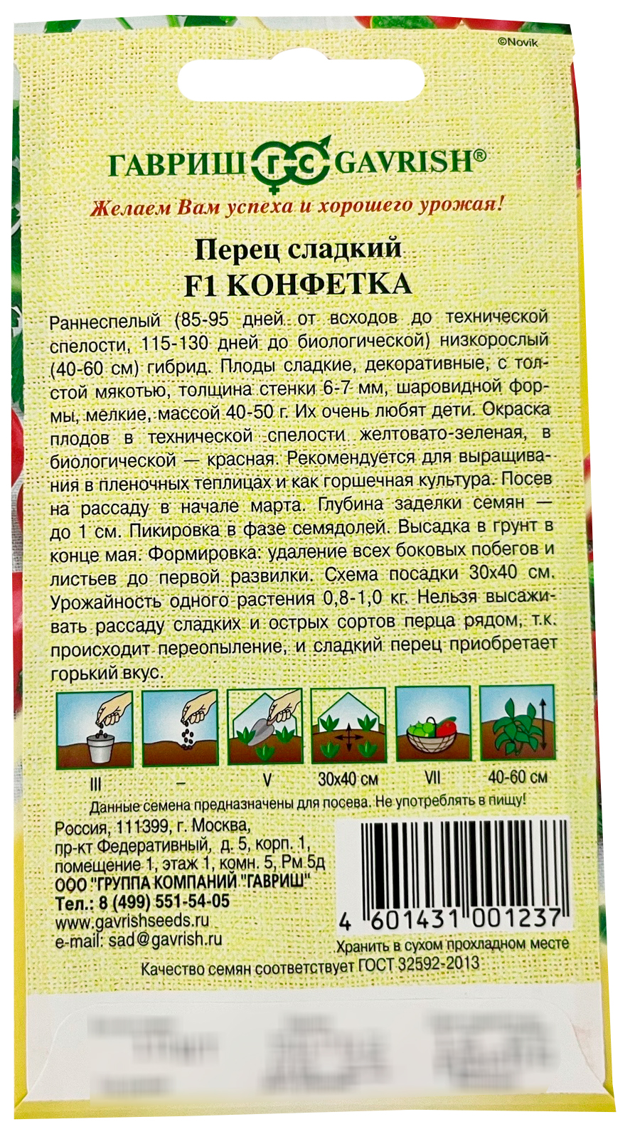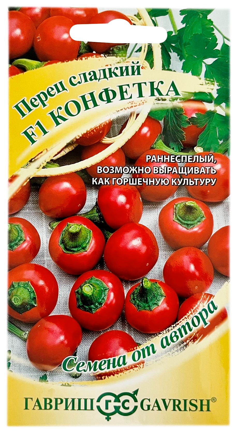 Перец сладкий КОНФЕТКА F1 ГАВРИШРаннеспелый (85-95 дней от всходов до технической спелости, 115-130 дней до биологической), низкорослый (40-60 см) гибрид. Плоды сладкие, декоративные, с толстой мякотью, толщина стенки 6-7 мм, шаровидной формы, мелкие, массой 40-50 г. Их очень любят дети. Окраска плодов в технической спелости – желтовато-зеленая, в биологической – красная. Рекомендуется для выращивания в пленочных теплицах и как горшечная культура. Посев на рассаду в начале марта. Пикировка в фазе семядолей. Высадка в грунт в конце мая. Формировка: удаление всех боковых побегов и листьев до первой развилки. Схема посадки 30x40 см. Урожайность одного растения 0,8-1,0 кг.