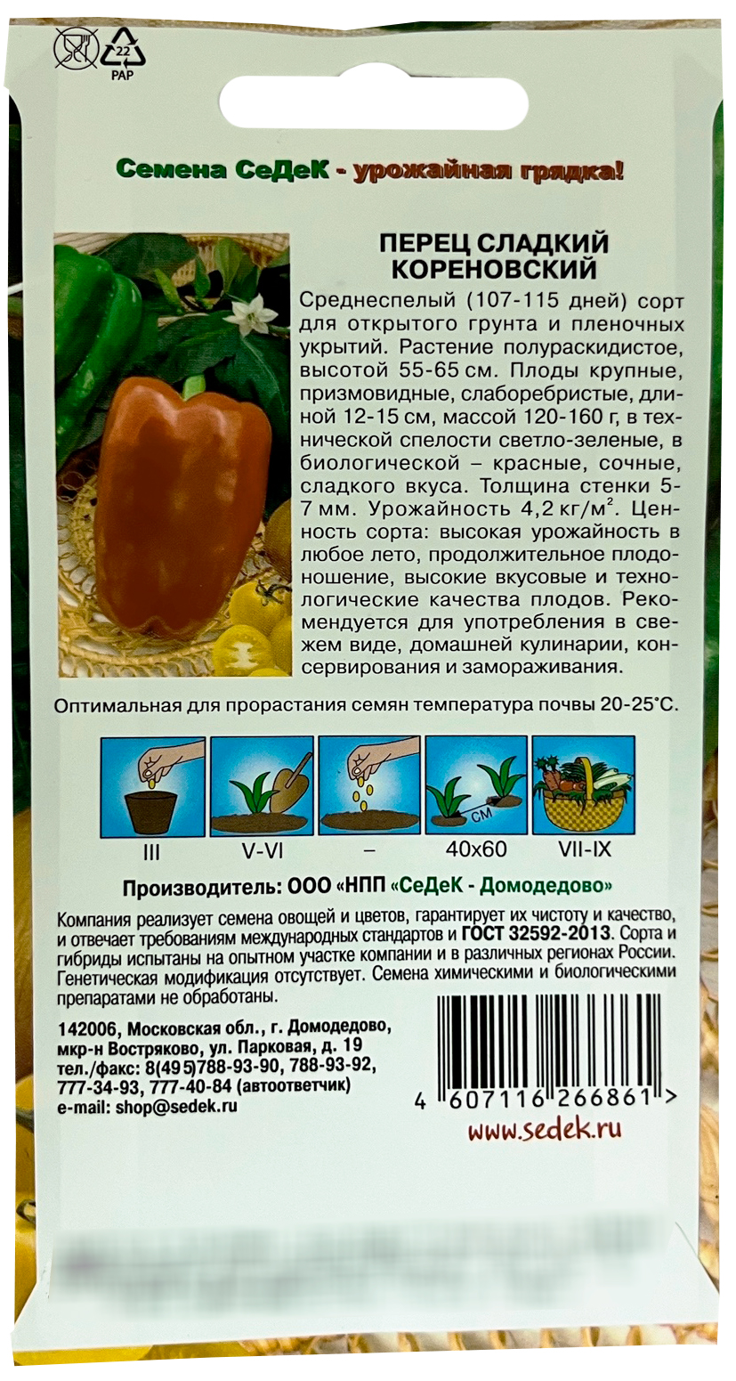 Перец сладкий КореновскийСреднеспелый (107-115 дней) сорт для открытого грунта и пленочных укрытий. Растение полураскидистое, высотой 55-65 см. Плоды крупные, призмовидные, слаборебристые, длиной 12-15 см, массой 120-160 г, в технической спелости светло-зеленые, в биологической – красные, сочные, сладкого вкуса. Толщина стенки 5-7 мм. Урожайность 4,2 кг/м²,. Ценность сорта: высокая урожайность в любое лето, продолжительное плодоношение, высокие вкусовые и технологические качества плодов. Рекомендуется для употребления в свежем виде, домашней кулинарии, консервирования и замораживания.