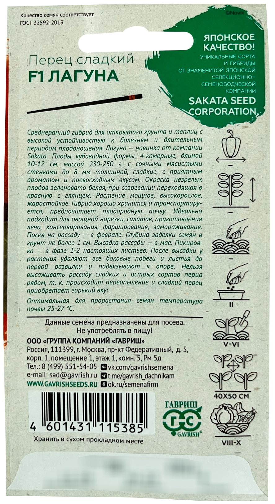 Перец Лагуна F1 Саката Н22 ГАВРИШСреднеранний гибрид для открытого грунта и теплиц с высокой устойчивостью к болезням и длительным периодом плодоношения Лагуна — новинка от компании Sakata. Плоды кубовидной формы, 4-х камерные, длиной 10-12 см и массой 230-250 г, с сочными и мясистыми стенками до 8 мм толщиной, сладкие, с приятным ароматом и превосходным вкусом. Окраска незрелых плодов зеленовато-белая, при созревании переходящая в красную с глянцем. Растение мощное, высокорослое, жаростойкое. Гибрид хорошо хранится и транспортируется, предпочитает плодородную почву. Идеально подходит для овощной нарезки, салатов, приготовления лечо, консервирования, фарширования, замораживания. Посев на рассаду — в феврале. Глубина заделки семян в грунт не более 1 см. Высадка рассады — в мае. Пикировка в фазе 1-2-х настоящих листьев. После высадки у растения удаляют все боковые побеги и листья до первой развилки и подвязывают к опоре. Нельзя высаживать рассаду сладких и острых сортов перца рядом, т.к. происходит переопыление и сладкий перец приобретает горький вкус.