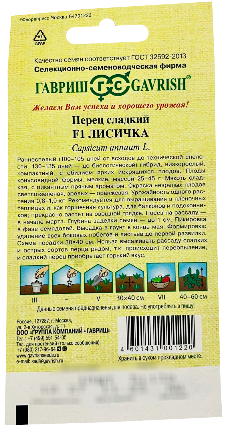 Перец сладкий Лисичка F1Раннеспелый гибрид (100-105 дней от всходов до технической спелости, 130-135 дней – до биологической), низкорослый, компактный с обилием ярких, искрящихся плодов. Плоды конусовидной формы, мелкие, массой 25-45 г. Мякоть сладкая, с пикантным пряным ароматом. Окраска плодов в технической спелости светло-зеленая, в биологической – оранжевая. Рекомендуется для выращивания в пленочных теплицах и как горшечная культура для балконов и подоконников, прекрасно растет на овощной грядке и в бордюре. Посев на рассаду в начале марта. Пикировка в фазе семядолей. Высадка в грунт в конце мая. Формировка: удаление всех боковых побегов и листьев до первой развилки. Схема посадки 30x40 см. Урожайность одного растения 0,8-1,0 кг.