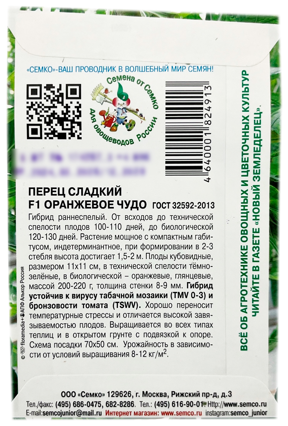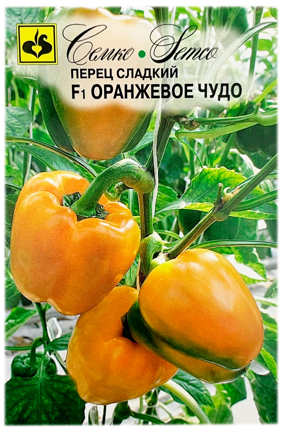 Перец сладкий F1 ОРАНЖЕВОЕ ЧУДО СЕМКОГибрид раннеспелый. От всходов до технической спелости плодов 100-110 дней. Растение высотой 90-110 см. Крупные плоды кубовидной формы 11x11 см, в технической спелости зеленого, в биологической - ярко-оранжевого цвета, глянцевые, массой 200-220 г. Толщина стенки плода до 10 мм. Гибрид устойчив к вирусу табачной мозаики. Предназначен для выращивания во всех типах теплиц. Семена прорастают за 15-20 дней при температуре 23-25°С. Оптимальный возраст рассады для высадки на постоянное место 50-60 дней.