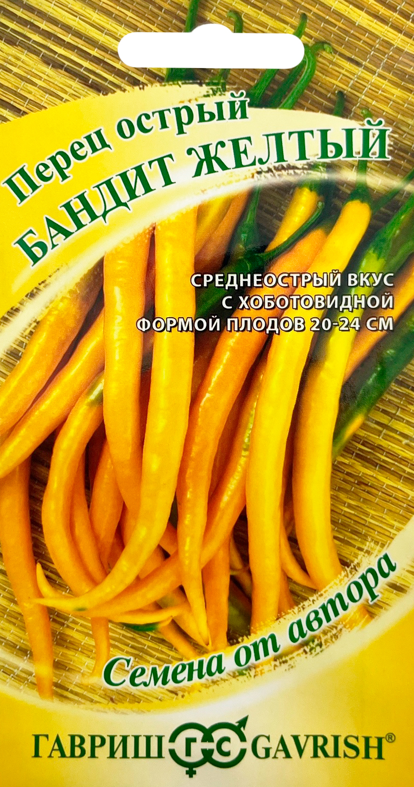 Перец острый Бандит желтыйРанний сорт (от всходов до первых сборов 100-105 дней) острого перца для выращивания в открытом грунте и пленочных теплицах. При выращивании в открытом грунте растение достигает высоту в 50-60 см. Плоды массой 40-50 г, хоботовидной формы, морщинистые, с поперечной волнистостью, длиной 20-24 см, диаметром 2-3 см. Стенки плодов толщиной 2-3 мм. Незрелые плоды зеленые, при созревании — желтеют. Вкус среднеострый, рекомендуется для домашней кулинарии, консервирования, маринования. Посев на рассаду — в конце февраля. Глубина заделки семян до 1 см. Пикировка — в фазе семядолей. Высадка рассады в грунт или в теплицу — в конце мая. Формировка: удаление всех боковых побегов и листьев до первой развилки. Схема посадки: 30x40 см. Урожайность товарных плодов под плёночными укрытиями - 3,9-4,0 кг/кв.м. Нельзя высаживать рассаду сладких и острых сортов перца рядом, т.к. происходит переопыление и сладкий перец приобретает горький вкус. Подходит для промышленного круглогодичного выращивания с использованием светокультуры в защищенном грунте.