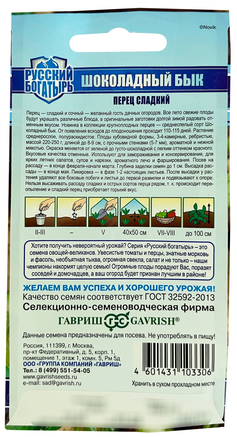 Перец сладкий Шоколадный бык серия Русский богатырь ГАВРИШПерец — сладкий и сочный — желанный гость дачных огородов. Все лето свежие плоды будут украшать различные блюда, а оригинальные заготовки долгой зимой радовать отменным вкусом. Новинка в коллекции крупноплодных перцев — среднеспелый сорт Шоколадный бык. От появления всходов до плодоношения проходит 110-115 дней. Растение среднерослое, полураскидистое. Плоды кубовидной формы, 3-4-х камерные, ребристые, массой 220-250 г, длиной до 8-9 см, с прочными стенками (5-7 мм), ароматной и нежной мякотью. Окраска меняется от зеленой до густо-шоколадной с легким оттенком красного. Вкусовые качества отменные. Используют для замораживания и консервирования, для ярких летних салатов, супов и нарезки, для ароматного лечо и фарширования. Посев на рассаду — в конце февраля. Глубина заделки семян до 1 см. Высадка рассады — в конце мае. Пикировка в фазе 1-2-х настоящих листьев. После высадки у растения удаляют все боковые побеги и листья до первой развилки и подвязывают к опоре. Нельзя высаживать рассаду сладких и острых сортов перца рядом, т.к. происходит переопыление и сладкий перец приобретает горький вкус.
