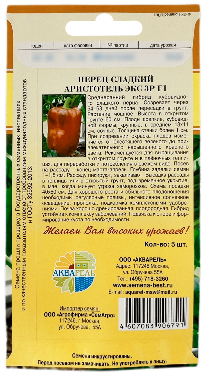 Перец сладкий АРИСТОТЕЛЬ ЭКС ЗР F1 АКВАРЕЛЬСредне - ранний гибрид кубовидного сладкого перца. Созревает через 64-68 дней после пересадки в грунт. Растение мощное. Высота в открытом грунте 60 см. Плоды крепкие, кубовидной формы, крупные, в среднем 13х11 см, сочные. Толщина стенки более 1 см. При созревании окраска плодов изменяется от блестящего зеленого до привлекательного насыщенного красного цвета. Отличается толерантность к растрескиванию, хорошей лёжкостью и транспортабельностью. Универсальный гибрид, рекомендуется для выращивания в открытом грунте и в плёночных теплицах, для переработки и потребления в свежем виде. Устойчивость к болезням Tobamo (Tobamo virus strains P0) - вирус табачной мозаики. BS 1-3 (Bacterial spot) - бактериальная пятнистость. PVY (Potato Virus Y strein P0) - Y-вирус картофеля.