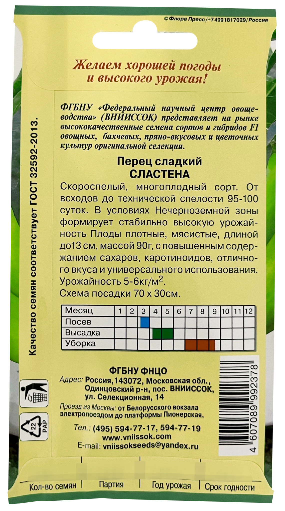 Перец сладкий СластенаРастение сомкнутое, среднерослое. Лист среднего размера, зеленый, слабоморщинистый. Плод пониклый, конусовидный, глянцевый, окраска в технической спелости желтоватая, в биологической - красная. Число гнезд 2-3. Масса плода 90 г, толщина стенки 6 мм. Вкус свежих плодов хороший. Урожайность товарных плодов в открытом грунте Центрального региона до 4,5 кг/кв.м. Хорошо переносит резкие перепады температуры.