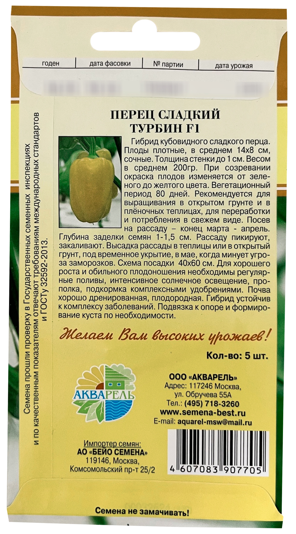 Перец сладкий Турбин F1 АКВАРЕЛЬГибрид кубовидного сладкого перца. Плоды плотные, в среднем 14х8 см, сочные. Толщина стенки до 1 см. При созревании окраска плодов изменяется от зеленого до желтого цвета. Вегетационный период 80 дней. Рекомендуется для выращивания в открытом грунте и в плёночных теплицах, для переработки и потребления в свежем виде. Посев на рассаду – конец марта -апрель. Глубина заделки семян 1-1,5 см. Рассаду пикируют, закаливают. Высадка рассады в теплицы или в открытый грунт, под временное укрытие, в мае, когда минует угроза заморозков. Схема посадки 40х60 см. Для хорошего роста и обильного плодоношения необходимы регулярные поливы, интенсивное солнечное освещение, прополка, подкормка комплексными удобрениями. Почва хорошо дренированная, плодородная. Гибрид устойчив к комплексу заболеваний. Подвязка к опоре и формирование куста по необходимости.