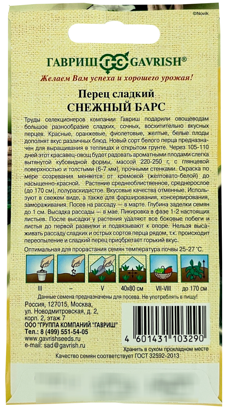 Перец сладкий СНЕЖНЫЙ БАРС ГАВРИШТруды селекционеров компании Гавриш подарили овощеводам большое разнообразие сладких, сочных, восхитительно вкусных перцев. Красные, оранжевые, фиолетовые, желтые, белые плоды дополнят вкус различных блюд. Новый сорт белого перца предназначен для выращивания в теплицах и открытом грунте. Через 105-110 дней этот красавец-овощ будет радовать ароматными плодами слегка вытянутой кубовидной формы, массой 220-250 г, с глянцевой поверхностью и толстыми (6-7 мм), прочными стенками. Окраска по мере созревания меняется от кремовой (желтовато-белой) до насыщенно-красной. Растение среднеоблиственное, среднерослое (до 170 см), полураскидистое. Вкусовые качества отменные. Используют в свежем виде, а также для фарширования, консервирования, замораживания. Посев на рассаду — в марте. Глубина заделки семян до 1 см. Высадка рассады — в мае. Пикировка в фазе 1-2-х настоящих листьев. После высадки у растения удаляют все боковые побеги и листья до первой развилки и подвязывают к опоре. Нельзя высаживать рассаду сладких и острых сортов перца рядом, т.к. происходит переопыление и сладкий перец приобретает горький вкус.